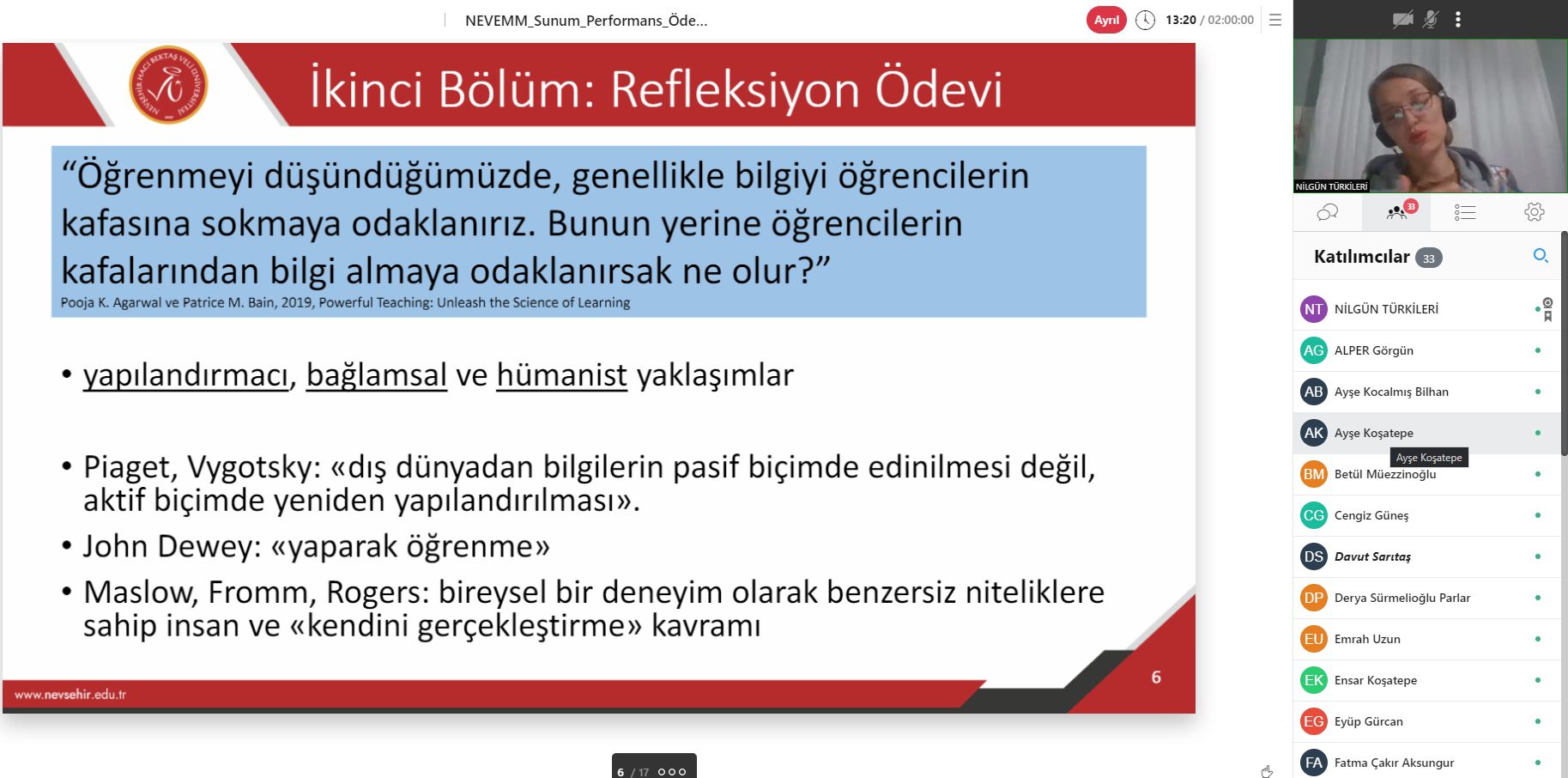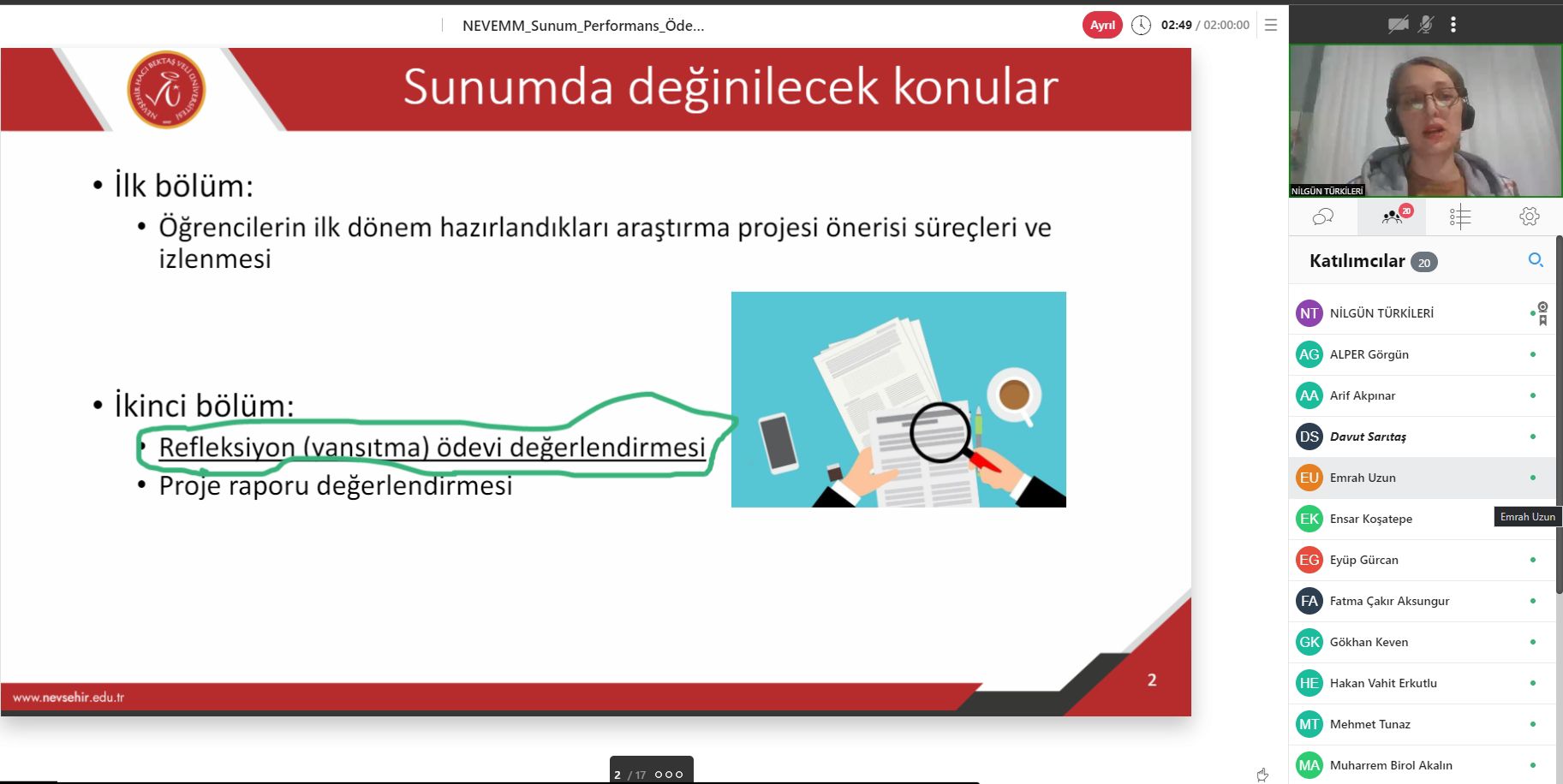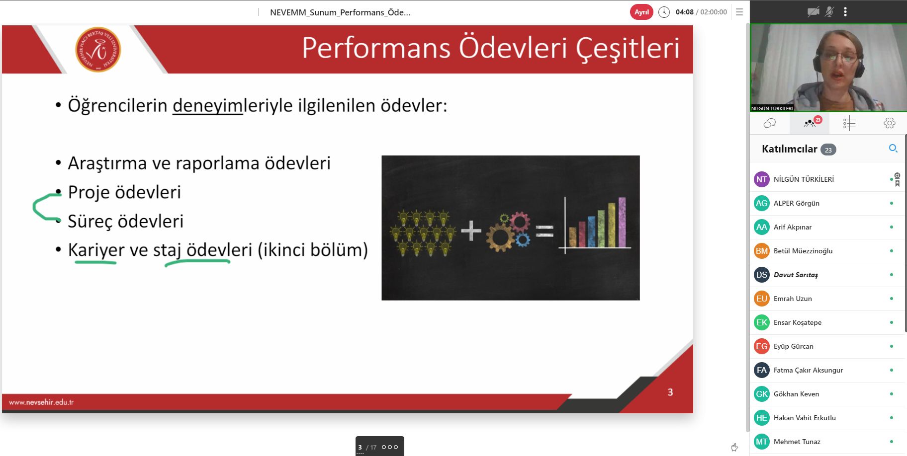 Seminerde NEVÜ Fen – Edebiyat Fakültesi Psikoloji Bölüm Başkanı ve NEVEMM Müdür Yardımcısı Dr. Öğr. Üyesi Nilgün Türkileri, eğitimin içeriği araştırma projesi, süreç ödevleri, kariyer ve staj ödevlerinde öğretim elemanlarının farklı izleme ve değerlendirmelerinde kullanabilecekleri yöntemlere değindi.