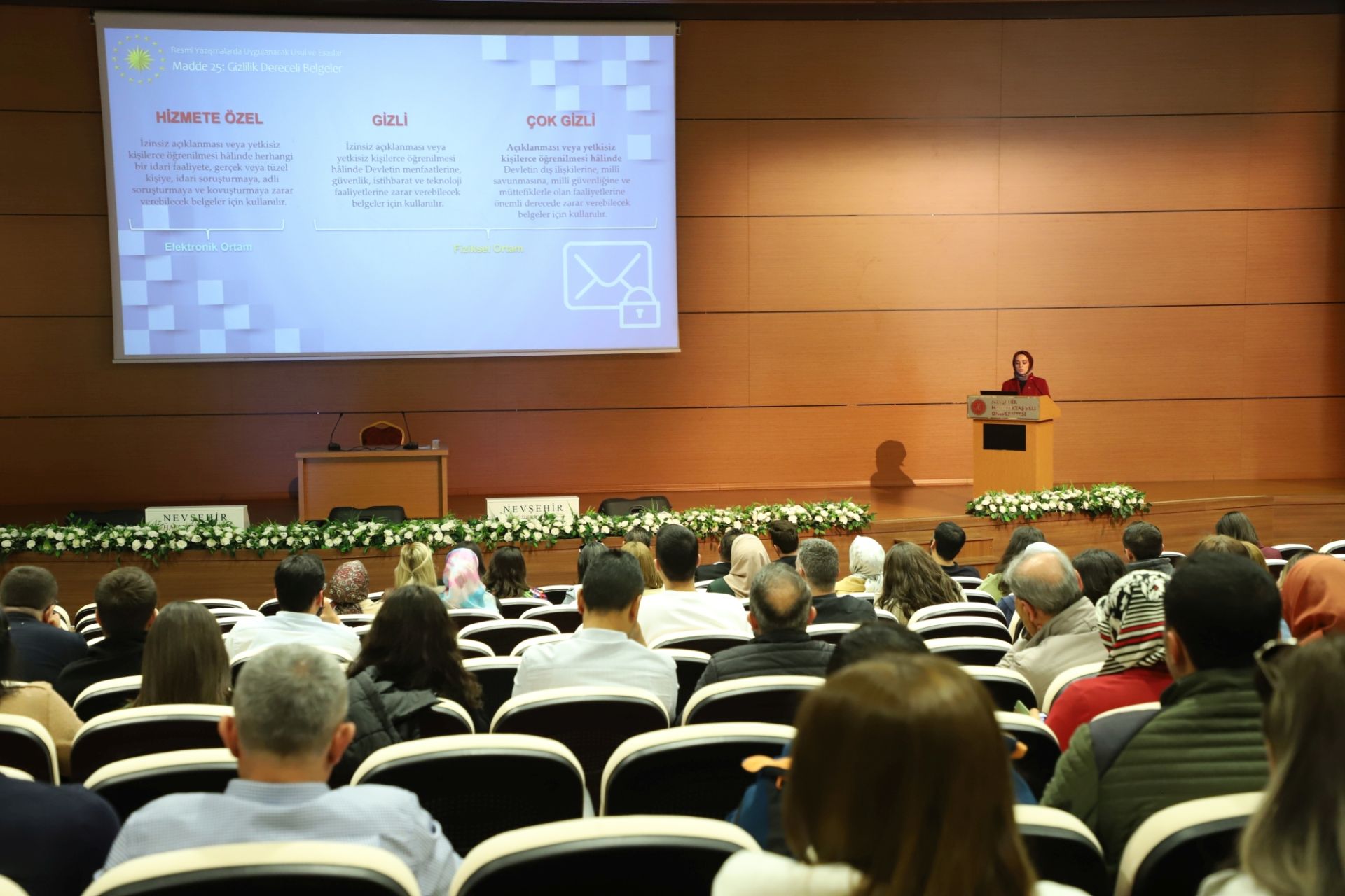 NEVÜ Vali Şinasi Kuş Kültür ve Kongre Merkezi’nde düzenlenen programa, NEVÜ, Nevşehir Valiliği ve Nevşehir Belediyesi personelleri katıldı. Cumhurbaşkanlığı Genel Sekreterliği Destek ve Mali Hizmetler Genel Müdürlüğü Bilgi ve Belge Yönetimi Daire Başkanlığı uzmanlarından Nida Kayalı ve Şefika Narlıoğlu, resmî yazışma süreçlerindeki mevzuat değişiklikleri, uygulama örnekleri ve dikkat edilmesi gereken kuralları katılımcılarla paylaştı.