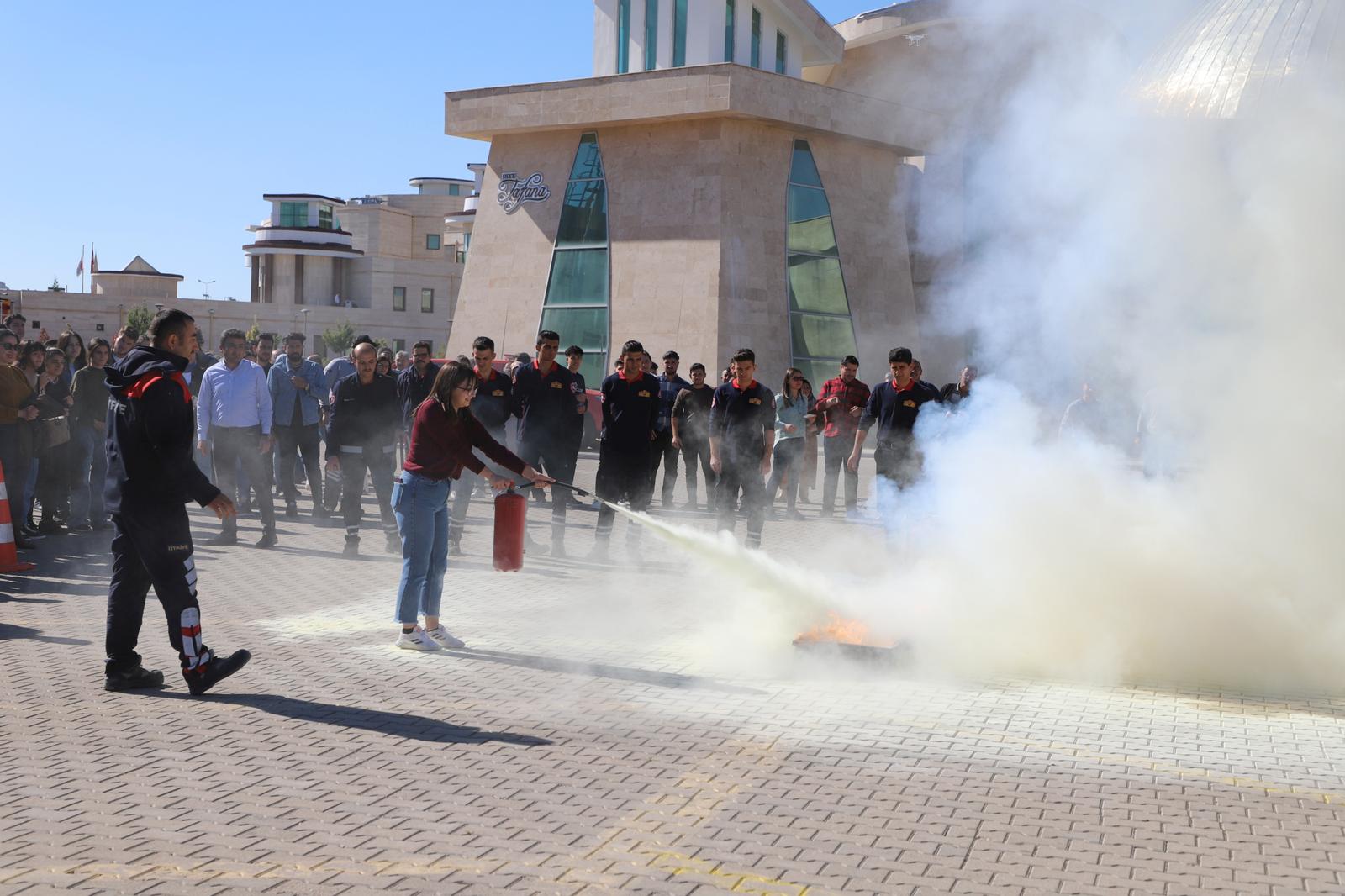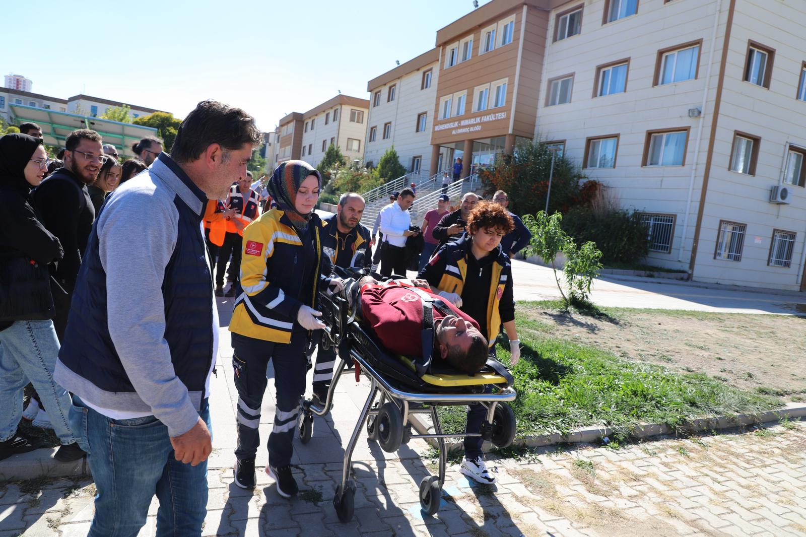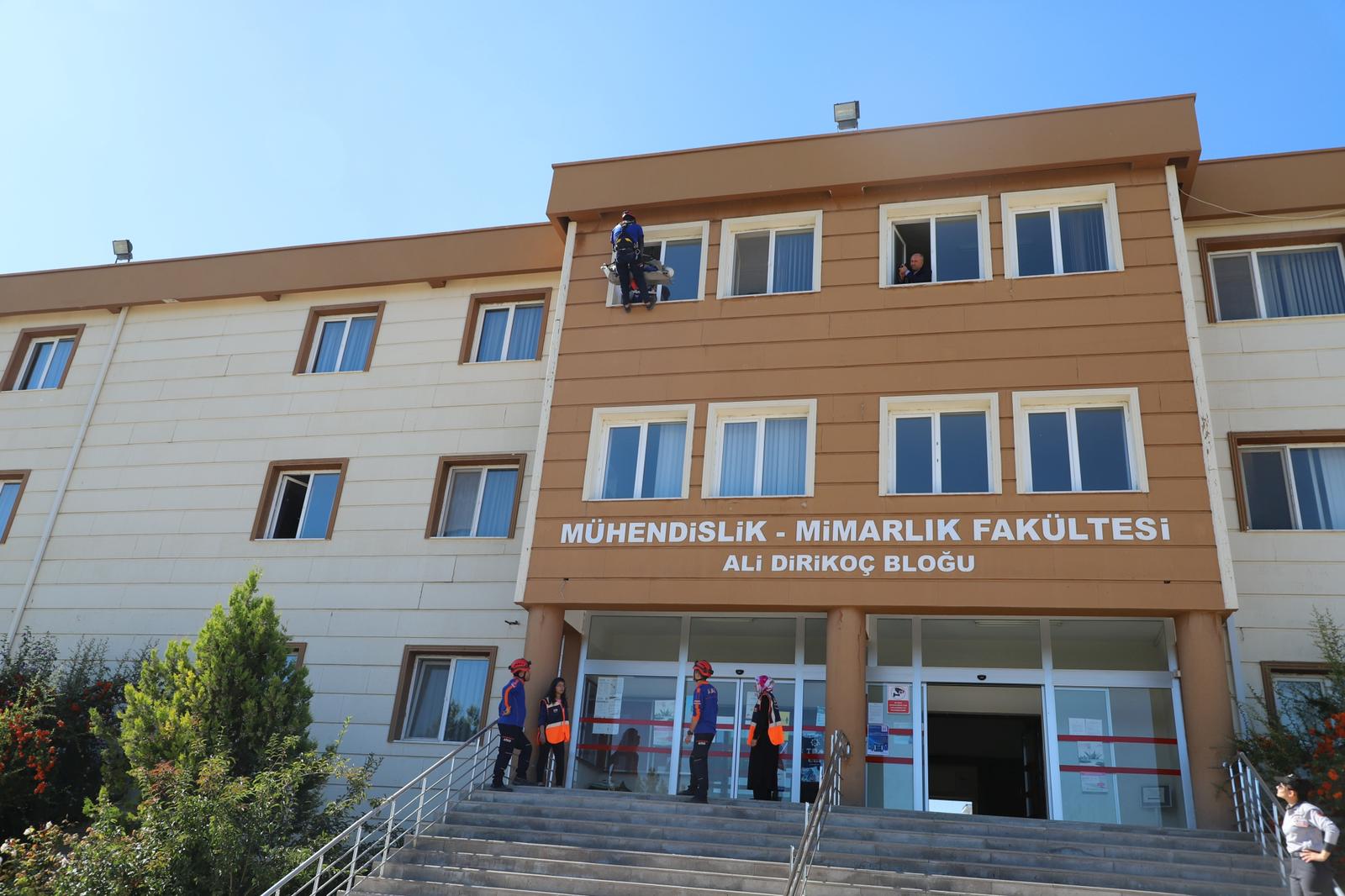 Mühendislik- Mimarlık Fakülte binasında olası deprem, yangın tahliye ve yaralı kurtarma tatbikatı, merkez büyük otopark alanında ise yangın söndürme eğitimi gerçekleştirildi. Tatbikatta, binada mahsur bulunan kişiler, AFAD ve itfaiye ekipleri tarafından kurtarılırken, alandaki yangın gerekli yangın ekipmanlarıyla söndürüldü.