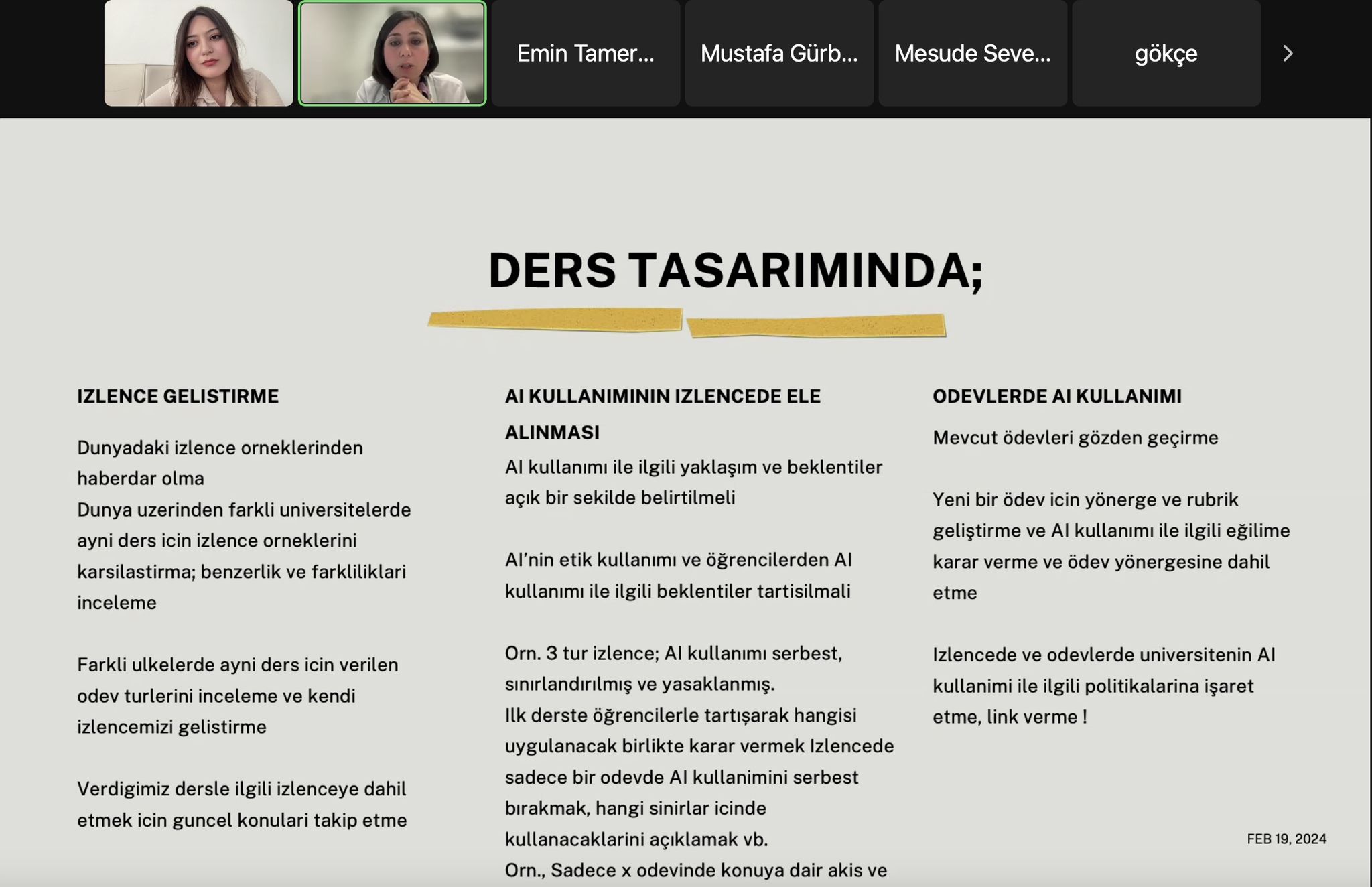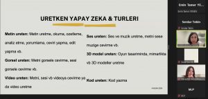 Eğitimde, üretken yapay zeka uygulamalarının ders tasarımı, ders içeriği oluşturma, ölçme-değerlendirme, ödevlendirme ve araştırma süreçlerinde nasıl kullanılabileceği konuları ele alındı. Bu doğrultuda Adobefly, Canva, Zoom, ChatGpt 3-4 ve Gemine gibi görsel, ses-video ve metin oluşturmada kullanılan üretken yapay zeka türlerinden örnekler verilerek etkileşimli uygulamalar gerçekleştirildi. Öğretim elemanlarının ve lisansüstü öğrencilerin yoğun ilgi gösterdiği eğitimin son bölümünde, sorular cevaplandırıldı.