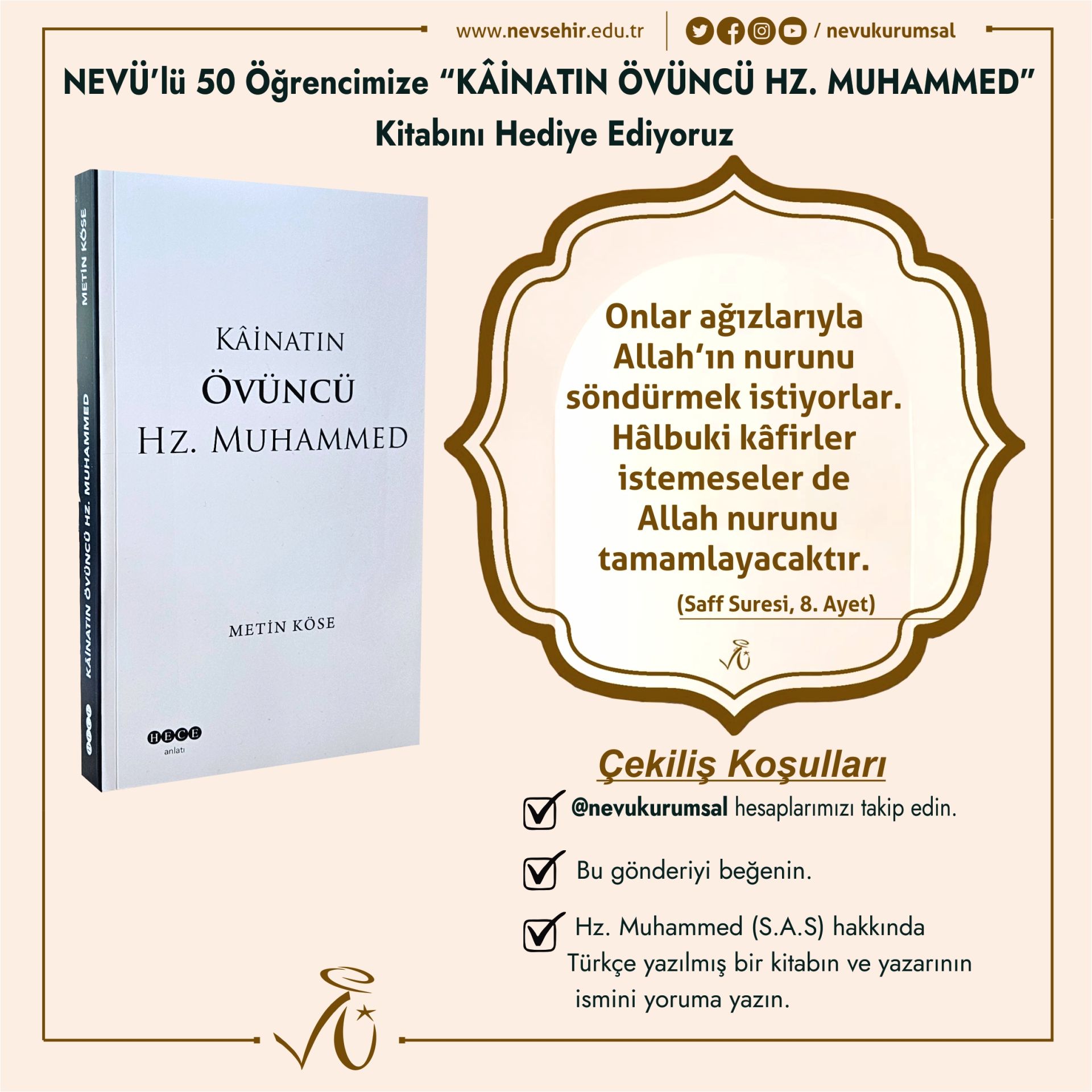 Çekiliş kapsamında, sosyal medya hesapları üzerinden yapılan “Kâinatın Övüncü Hz. Muhammed” paylaşımını beğenen, Hz. Muhammed (S.A.S.) hakkında Türkçe yazılmış bir kitabın ve yazarının ismini yorum olarak yazan, ayrıca @nevukurumsal ile @nevukariyer hesaplarını takip eden öğrenciler arasından yapılacak çekilişle belirlenecek 50 kişiye kitap hediye edilecek.