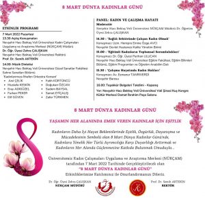 Kadınların daha iyi hayat beklentilerinde eşitlik, özgürlük, dayanışma ve mücadelesinin sembolü olan “8 Mart Dünya Kadınlar Günü”nde, kadınlara yönelik her türlü ayrımcılığa karşı duyarlılığı arttırmak ve kadınların her alanda güçlenmesine katkıda bulunmak amacıyla NEVÜ Kadın Çalışmaları Uygulama ve Araştırma Merkezi (NÜKÇAM) tarafından 7 Mart 2022 tarihinde bir dizi program düzenlenecek.