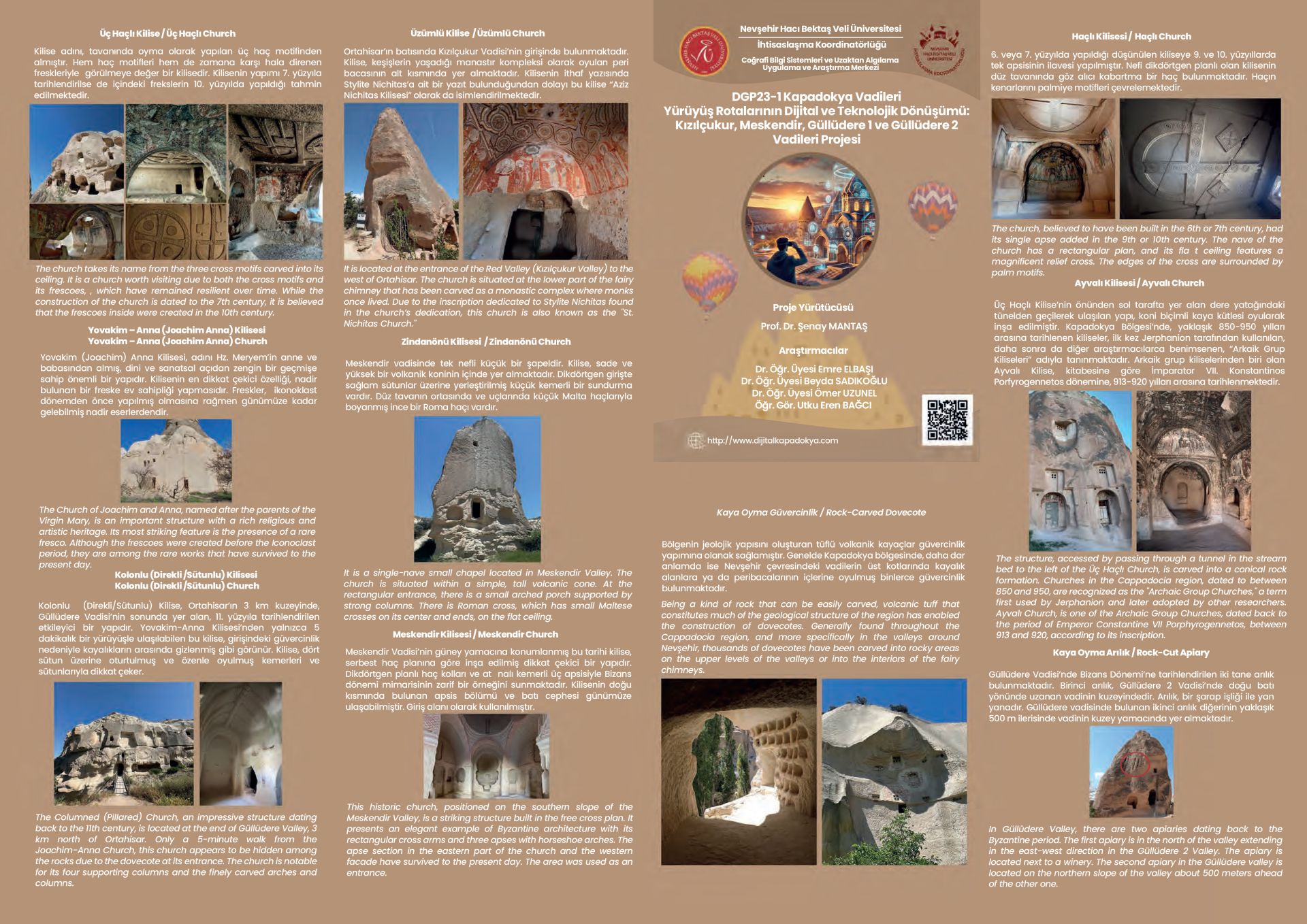 Çalışma kapsamında Coğrafi Bilgi Sistemleri (CBS) kullanılarak vadilerin 3D modellemesi ve haritaları hazırlandı. Yürüyüş rotaları üzerindeki Üzümlü Kilise, Direkli Kilise ve Haçlı Kilise gibi Bizans Dönemi’ne ait tescilli kültür varlıkları hakkında güncel bilgilerin ve görsellerin yer aldığı kapsamlı bir web sitesi oluşturuldu.