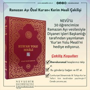 Üniversitenin @nevukurumsal Twitter, Instagram ve Facebook hesapları üzerinden “Ramazan Ayı Özel Kur’an-ı Kerim Meali Çekilişi” başlığıyla yapılan paylaşımda Cumhuriyet Döneminde ilk Türkçe Kur’an Tefsirinin kim tarafından yapıldığını yoruma yazan, paylaşımı beğenerek kendi hesaplarında paylaşan ve @nevukurumsal hesabını takip eden öğrenciler arasından yapılacak çekilişle 30 Kur’an-ı Kerim sahibini bulacak.