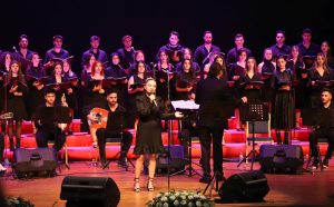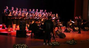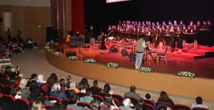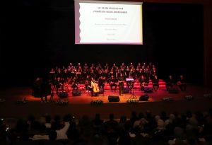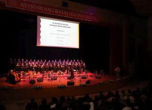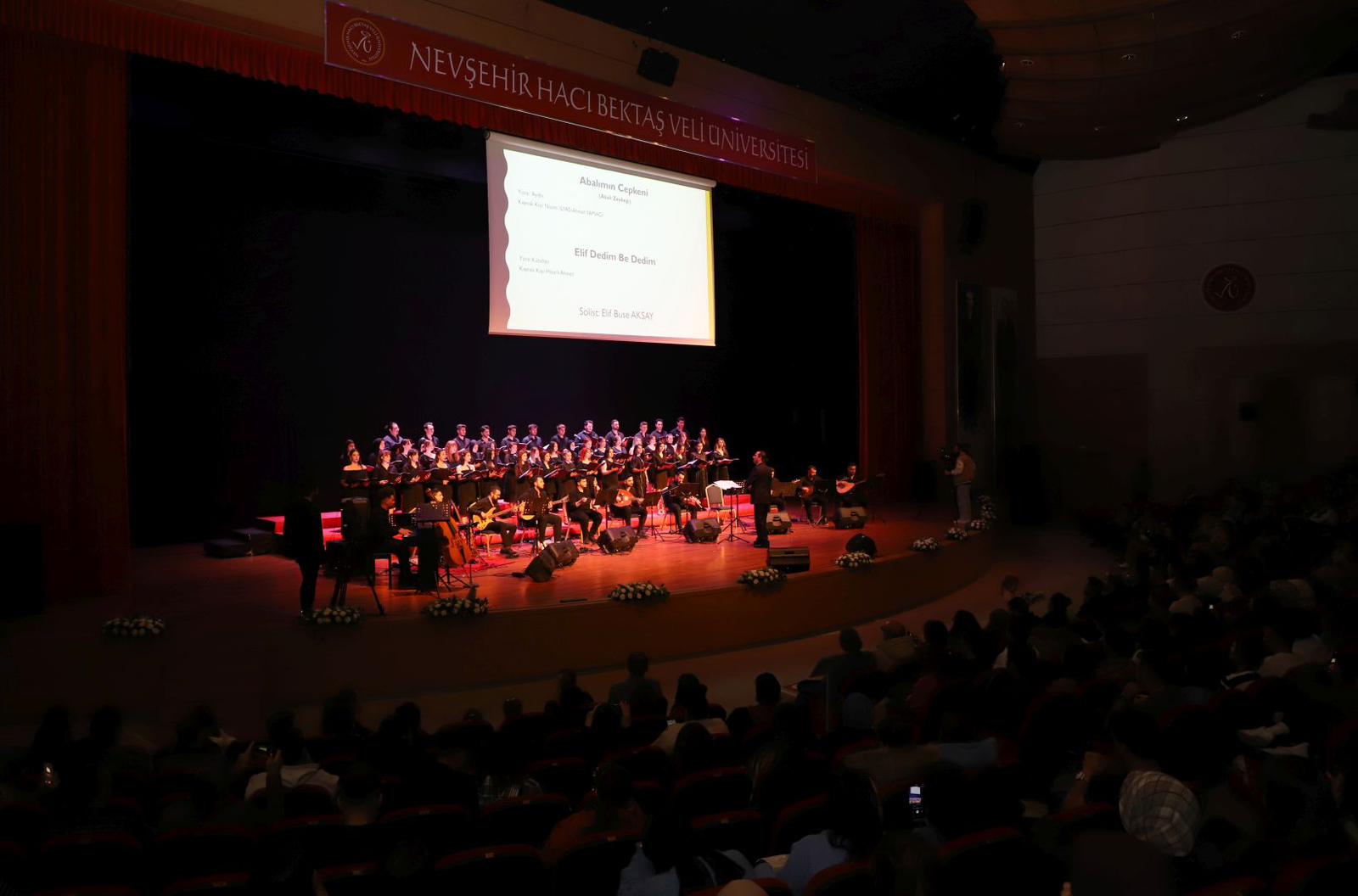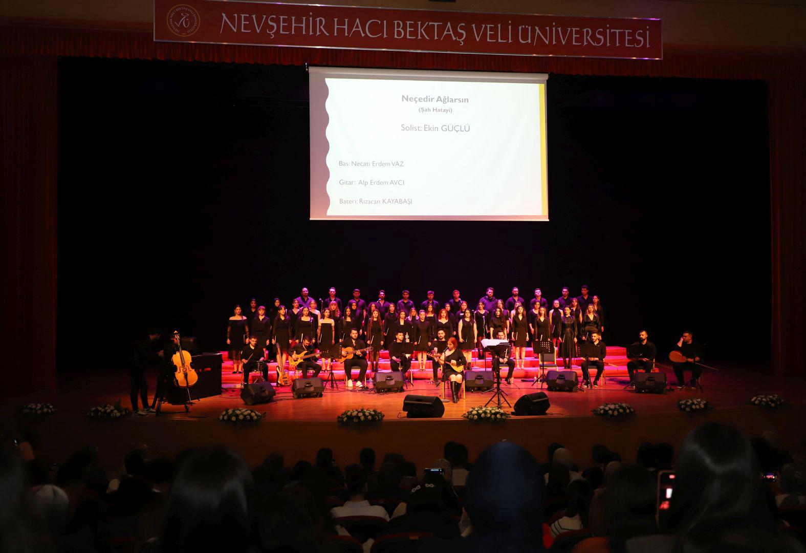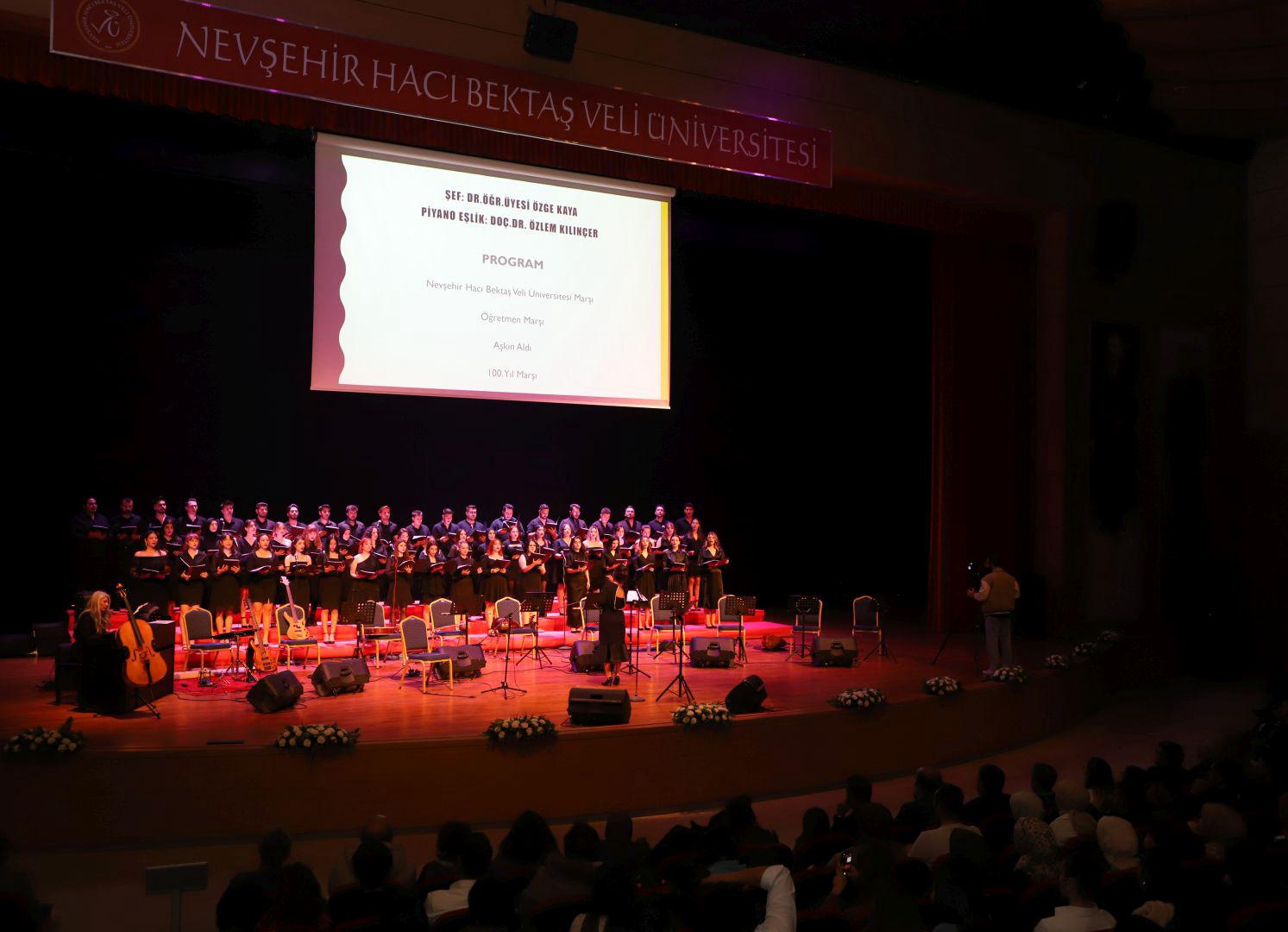 Dr. Öğr. Üyesi Özge Kaya’nın yönetmenliği ve Doç. Dr. Özlem Kılınçer’in piyano eşliğinde gerçekleştirilen konserin birinci bölümünde sahne alan koro ekibi ‘Nevşehir Hacı Bektaş Veli Üniversitesi Marşı’, ‘Öğretmen Marşı’, ‘Aşkın Aldı’ ve ‘Yüzüncü Yıl Marşı’nı seslendirildi.