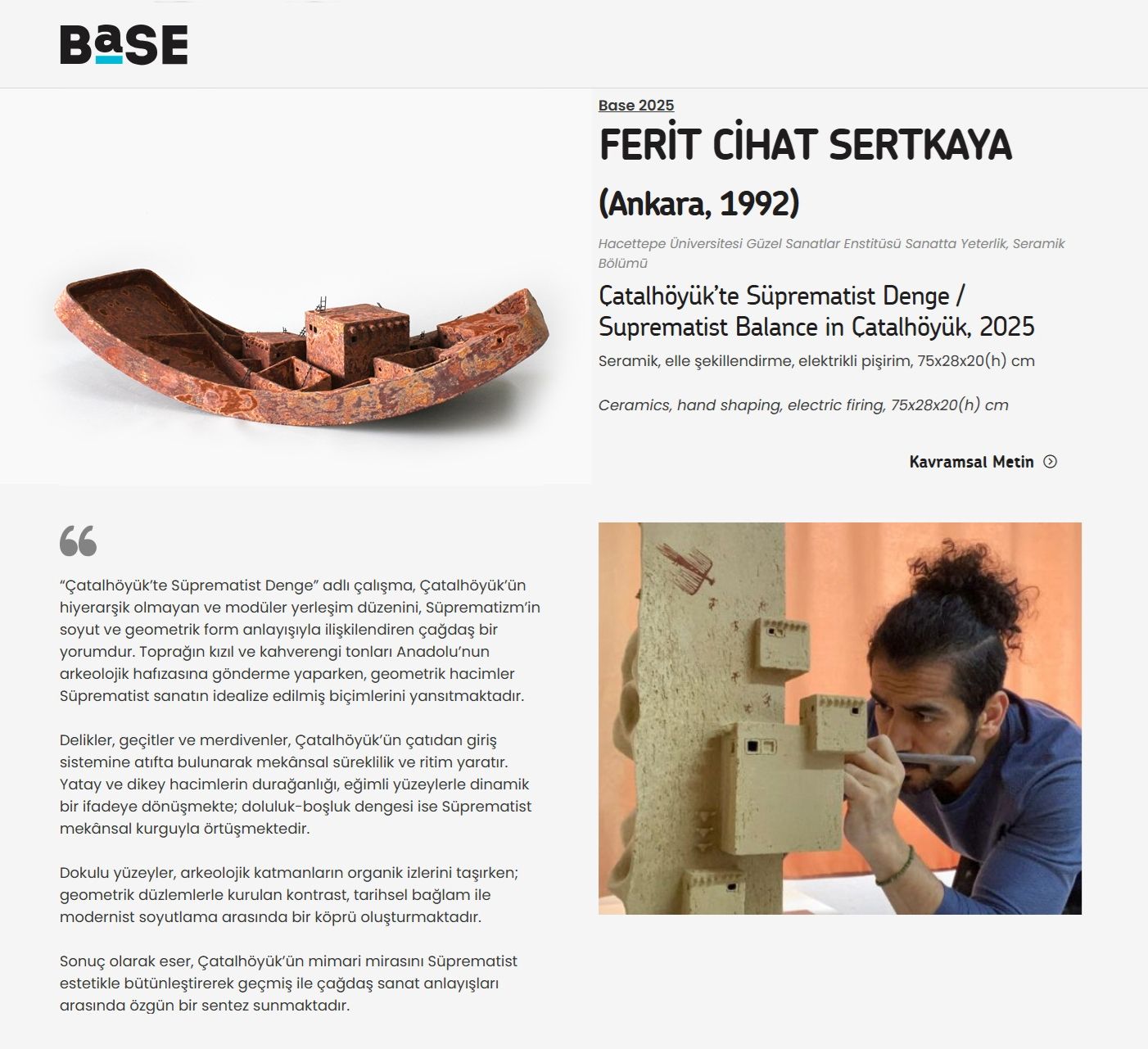 Nevşehir Hacı Bektaş Veli Üniversitesi (NEVÜ) Güzel Sanatlar Fakültesi Araştırma Görevlisi Dr. Ferit Cihat Sertkaya, “Çatalhöyük’te Süprematist Denge” adlı eseriyle Türkiye’nin yeni mezun sanatçı platformu BASE 2025 seçkisine katıldı.