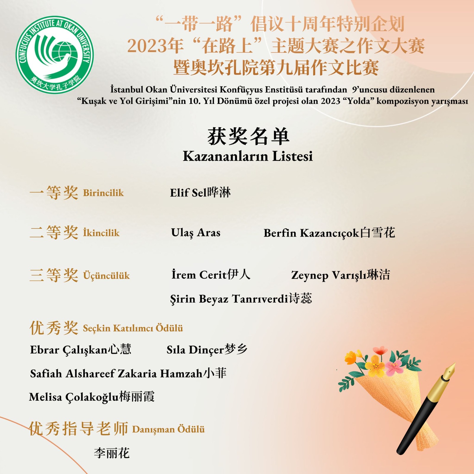 Konfüçyüs Enstitüsü’nün Kuşak ve Yol Girişimi’nin 10. yıl özel projesi olan yarışmada; 2. sınıf öğrencilerinden Elif Sel birincilik ödülü, 3. Sınıf öğrencilerinden Ulaş Aras ve 2. Sınıf öğrencilerinden Berfin Kazancıçok ikincilik ödülü, 2. Sınıf öğrencilerinden Zeynep Varışlı ve Şirin Beyaz Tanrıverdi üçüncülük ödülü almaya hak kazandı. Derece alan öğrencilerin her birine para ödülü ve başarı belgesi verildi.