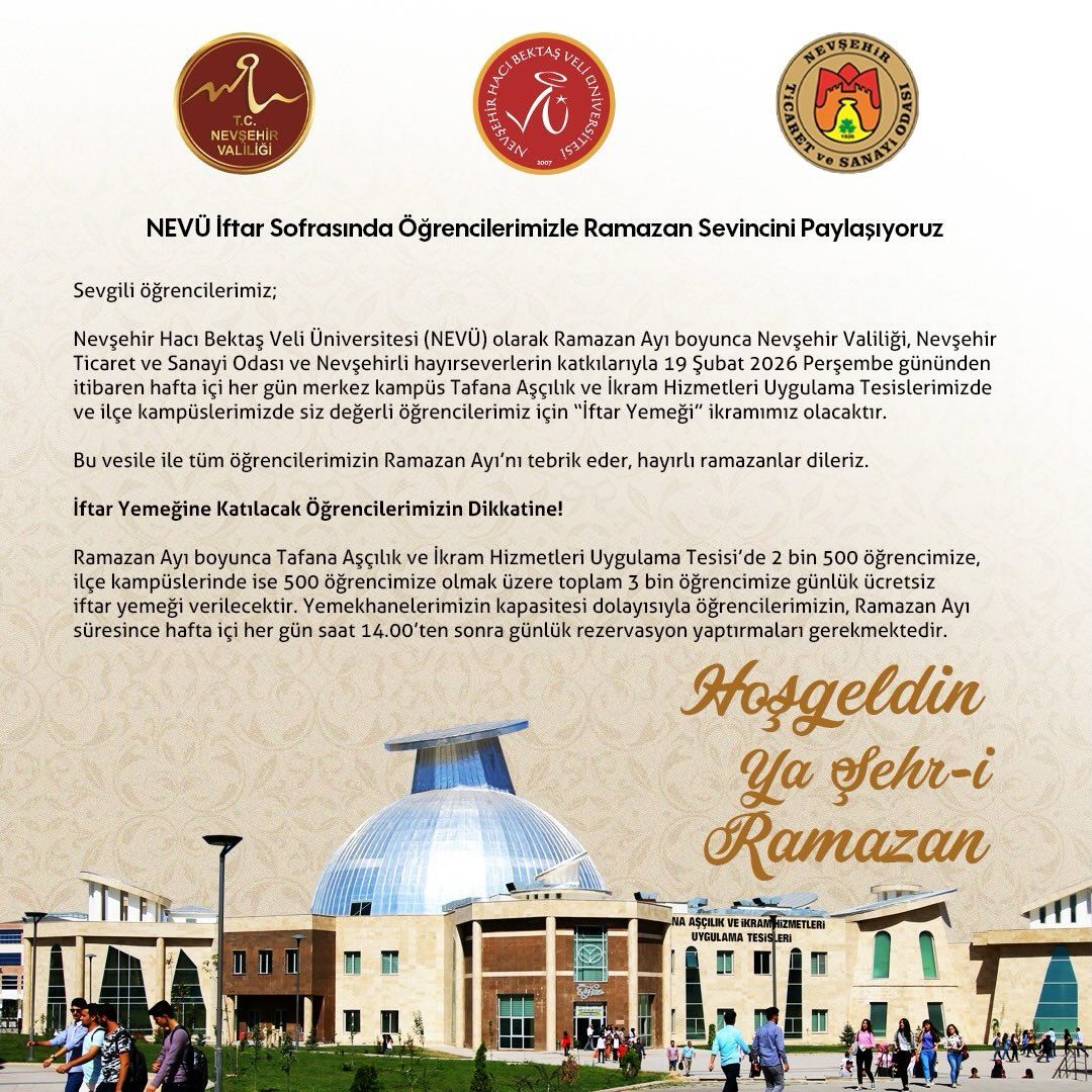 NEVÜ tarafından 19 Şubat 2026 Perşembe gününden itibaren Ramazan ayı boyunca hafta içi her gün merkez ve ilçe kampüslerinde toplam 3 bin öğrenciye ücretsiz iftar yemeği hizmeti sunulacak.