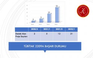 Aktekin devamında “Üniversitemizin ‘TÜBİTAK 2209-A Üniversite Öğrencileri Araştırma Projeleri Destekleme Programı’ kapsamındaki başarısı ciddi şekilde artış göstermektedir. Öyle ki 2022 yılının sadece ilk yarısı içerisinde önceki yıllarda destek alan projelerin toplam sayısından daha fazla sayıda proje bir defada destek almaya hak kazandı. Yıllar içerisinde öğrencilerimizin TÜBİTAK tarafından desteklenen proje sayıları şu şekilde gerçekleşmiştir: 2020 yılında 2 proje, 2021 yılında 17 proje, 2022 yılı ilk yarısında 21 projemiz destek almaya hak kazandı. Üniversitemizin araştırma yapan öğrenci ve akademisyenlerimize desteği artarak devam edecektir, bu manada öğrencilerimizi bir sonraki TÜBİTAK çağrısına proje başvurusu yapmaya davet ediyorum. Teknoloji Transfer Ofisimizin proje hazırlama konusundan desteğe ihtiyaç duyan tüm öğrenci ve akademisyenlerimizin hizmetinde olduğunu hatırlatıyorum” diye konuştu.