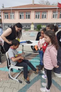 Sanat-1 İstasyonu’nda (Müzik) çocuklara gitar, melodika, ukulele müzik aletleri tanıtılarak çalındı ve çocukların da çalmaları sağlandı. Gitarla şarkı söyleyip geri dönüşüm malzemeleriyle marakas yapımı anlatılan etkinlikte ayrıca çocuklara, uyarlama bir de şarkı fontu öğretilerek alkışlarla ritim tutma çalışması gerçekleştirildi.