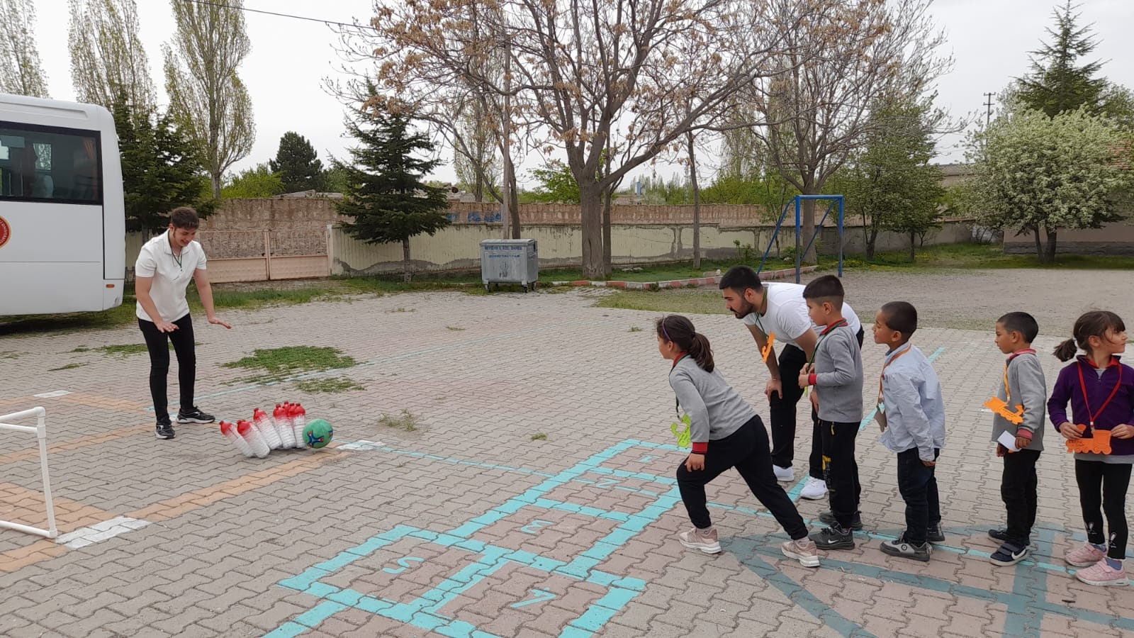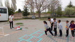 Beden Eğitimi İstasyonu’nda ise masa tenisi araç ve gereçleri tanıtılarak raketlerle top sektirme çalışması yaptırılan çocuklar ayrıca el yapımı mini kaleye penaltı atışları yaptı. Penaltı atışlarının ardından çocuklara voleybol kuralları anlatılarak parmak pası ve su şişelerinden yapılmış labutlara topla atış yaptırılarak, bowling oyunu oynamaları sağlandı.