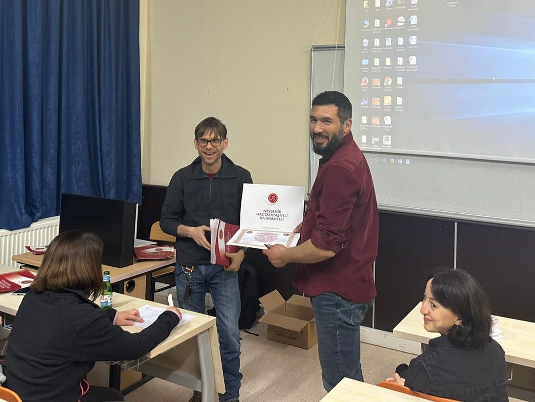 Üniversite – sektör iş birliğinin güzel ve etkili bir örneği olan eğitimin sonunda başarılı olan kursiyerlere başarı sertifikaları takdim edildi. NEVSEM Müdürü Doç Dr. Hasan Çetinel, söz konusu eğitimin planlanması, organize edilmesi ve başarıyla yürütülmesi sürecindeki katkılarından dolayı NEVÜ Öğr. Üyesi Prof. Dr. Tolga Uyar’a teşekkür belgesi takdim etti.