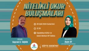 Nevşehir Belediyesi Kültür ve Sosyal İşler Müdürlüğü ile Güfte Edebiyat tarafından düzenlenecek olan Nitelikli Okur Buluşmaları, 28 Eylül 2024 Cumartesi günü Kapadokya Kültür ve Sanat Merkezi’nde gerçekleştirilecek. Saat 12.00’de başlayacak olan ve Yönlendiriciliğini Güfte Edebiyat Genel Yayın Yönetmeni Ayşe Ay’ın yapacağı etkinliğin konuğu Eğitimci Yazar Bayram S. Taşkın olacak.