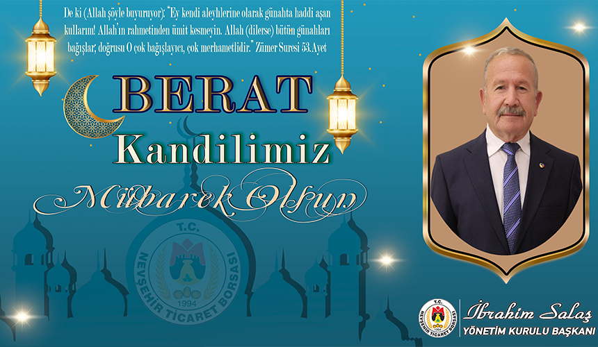 Nevşehir Ticaret Borsası (NTB) Yönetim Kurulu Başkanı İbrahim Salaş, Berat Kandili münasebetiyle bir kutlama mesajı yayınladı. Başkan Salaş, mesajında, Berat Kandili’nin tüm İslam alemine hayırlar getirmesini temenni ederek, bu özel gecenin insanların gönül dünyasına ışık tutarak günahlardan arınmasına vesile olduğunu belirtti.