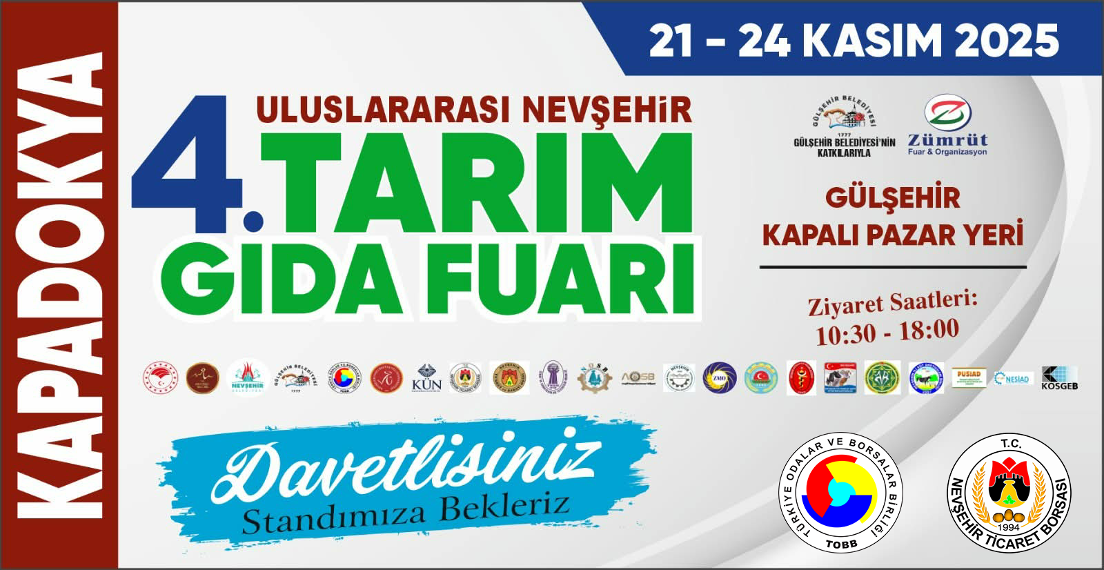 Nevşehir Ticaret Borsası Başkanı İbrahim Salaş, 21-24 Kasım 2025 tarihleri arasında gerçekleştirilecek 4.Nevagri’25 Uluslararası Nevşehir Tarım Gıda ve Hayvancılık Fuarı’na tüm vatandaşları davet etti.