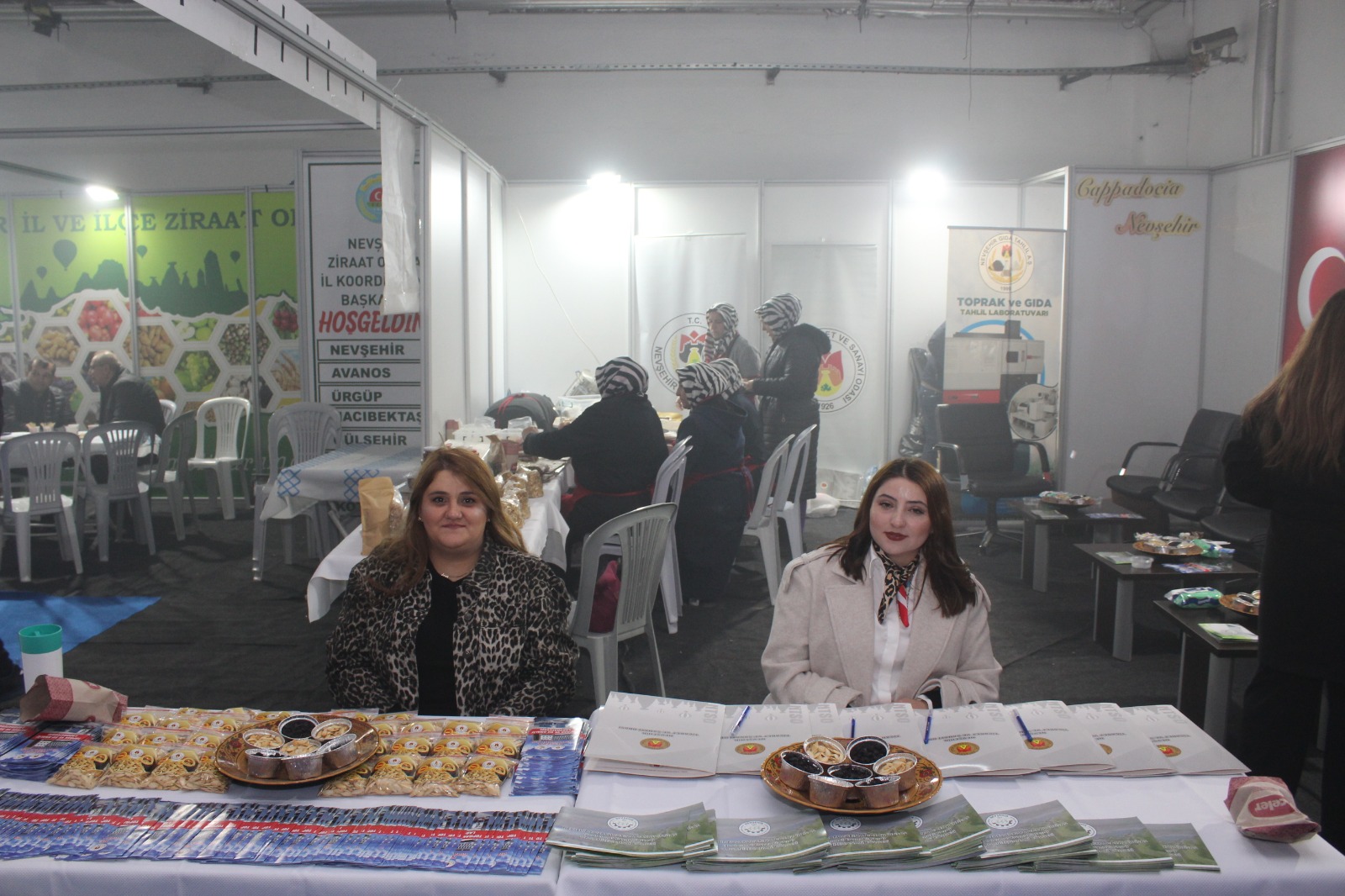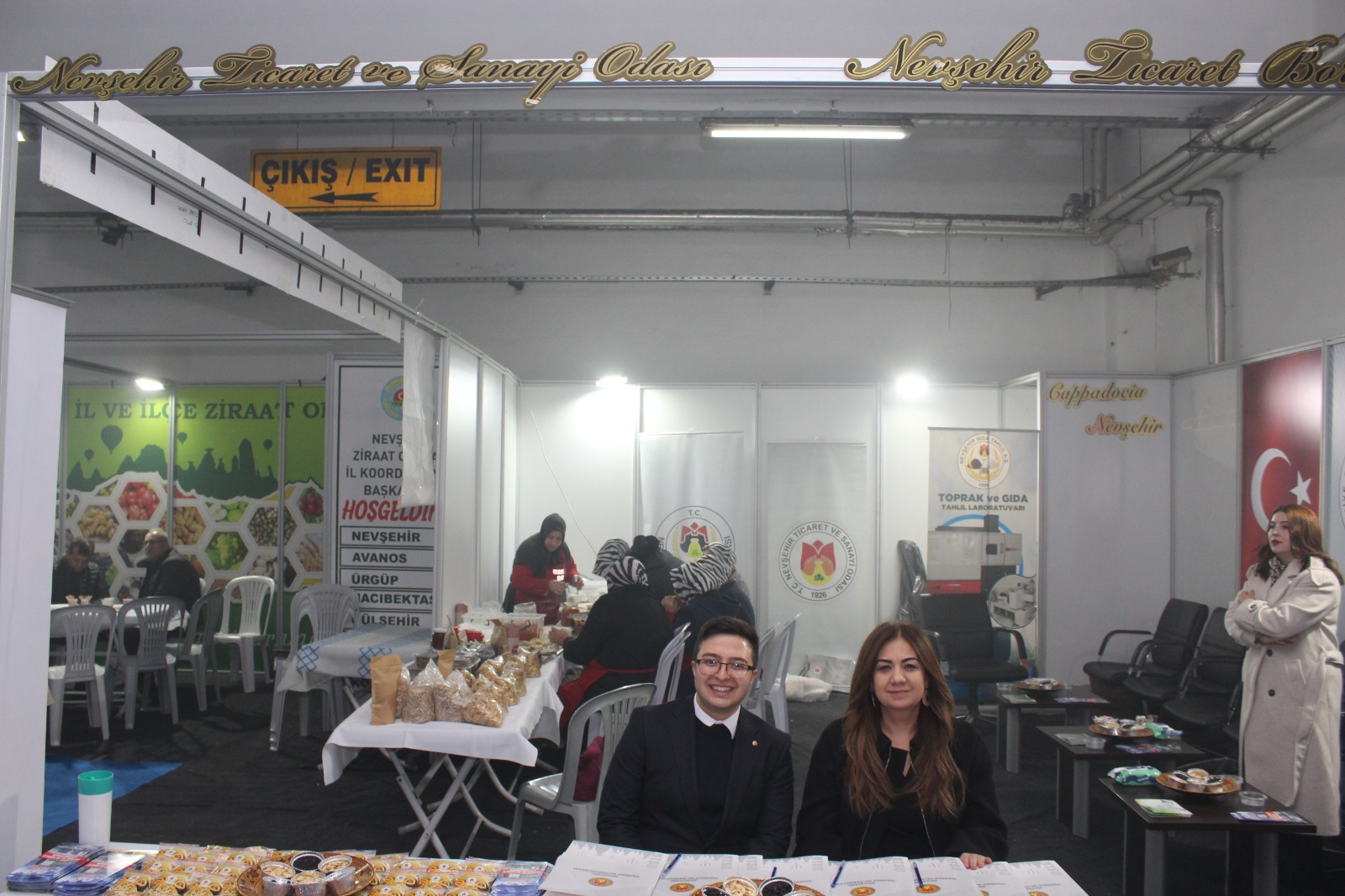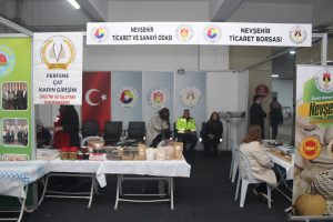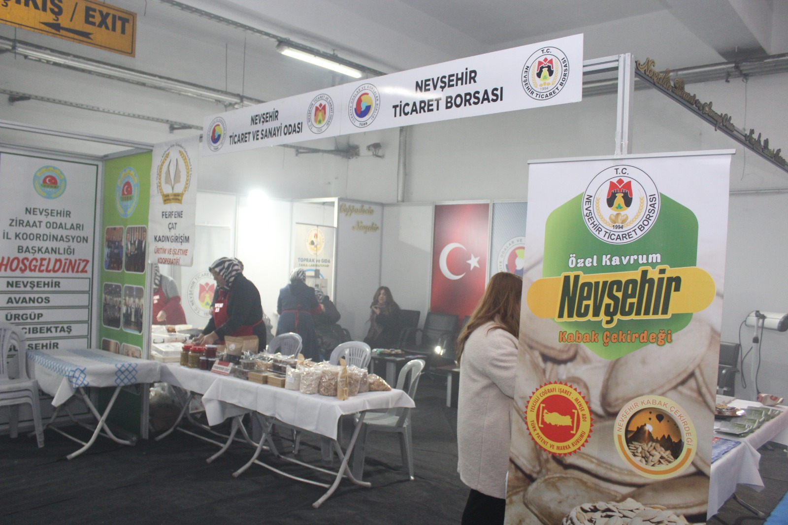 Ziyaretçilerden büyük ilgi gören Nevşehir Ticaret Borsası standında, coğrafi işaretli meşhur kabak çekirdeği ile Çat Ferfene Kadın Kooperatifi tarafından kuru üzüm, pekmez, köftür, el yapımı erişte, mantı, gözleme, salamura yaprak, üzüm turşusu, salça, acılı gibi Nevşehir’in yöresel ürünleri sergilendi.