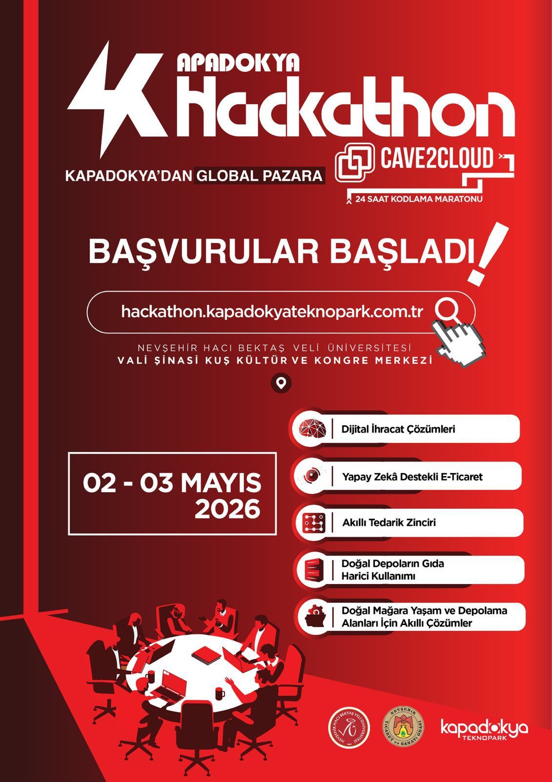 Nevşehir Ticaret ve Sanayi Odası, Nevşehir Hacı Bektaş Veli Üniversitesi ve Kapadokya Teknopark iş birliğinde 2-3 Mayısta düzenlenecek olan Kapadokya Hackathon, bölge sanayisinin dijital dönüşümüne katkı sağlamak ve yerel üretim gücünü küresel düzeyde rekabetçi seviyeye ulaştırmak amacıyla gerçekleştirilecektir.