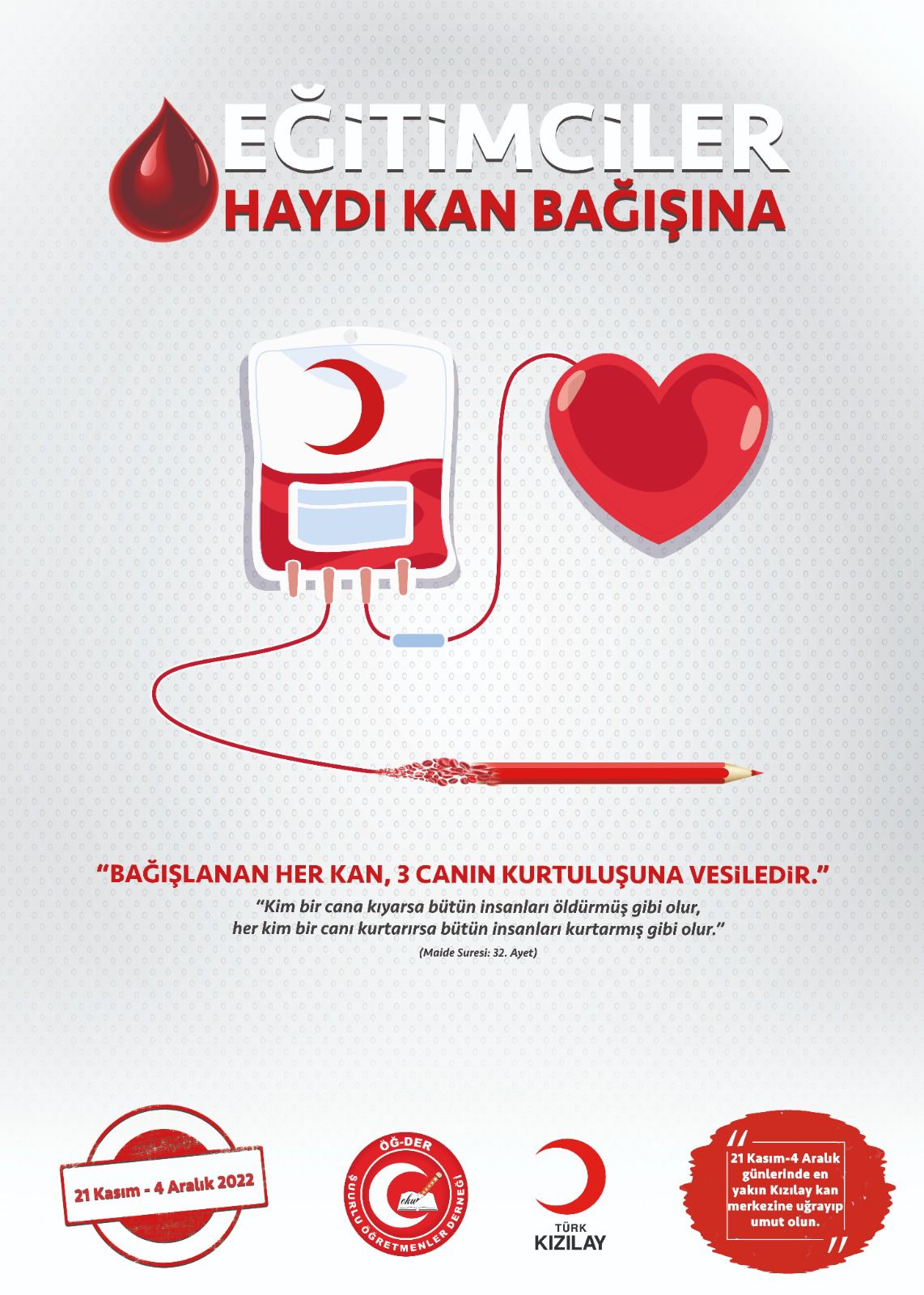 ÖĞ-DER’in kan bağışı kampanyasına iştirak etmek isteyen herkes 21 Kasım – 4 Aralık günleri arasında bulunduğu ilde en yakın Kızılay Kan Bağış Merkezi’ne gelerek kan bağışında bulunabilir. ÖĞ-DER, Genel Merkezi dahil olmak üzere 60 şubesini kan bağışı kampanyasında aktif görev almaya davet etti.