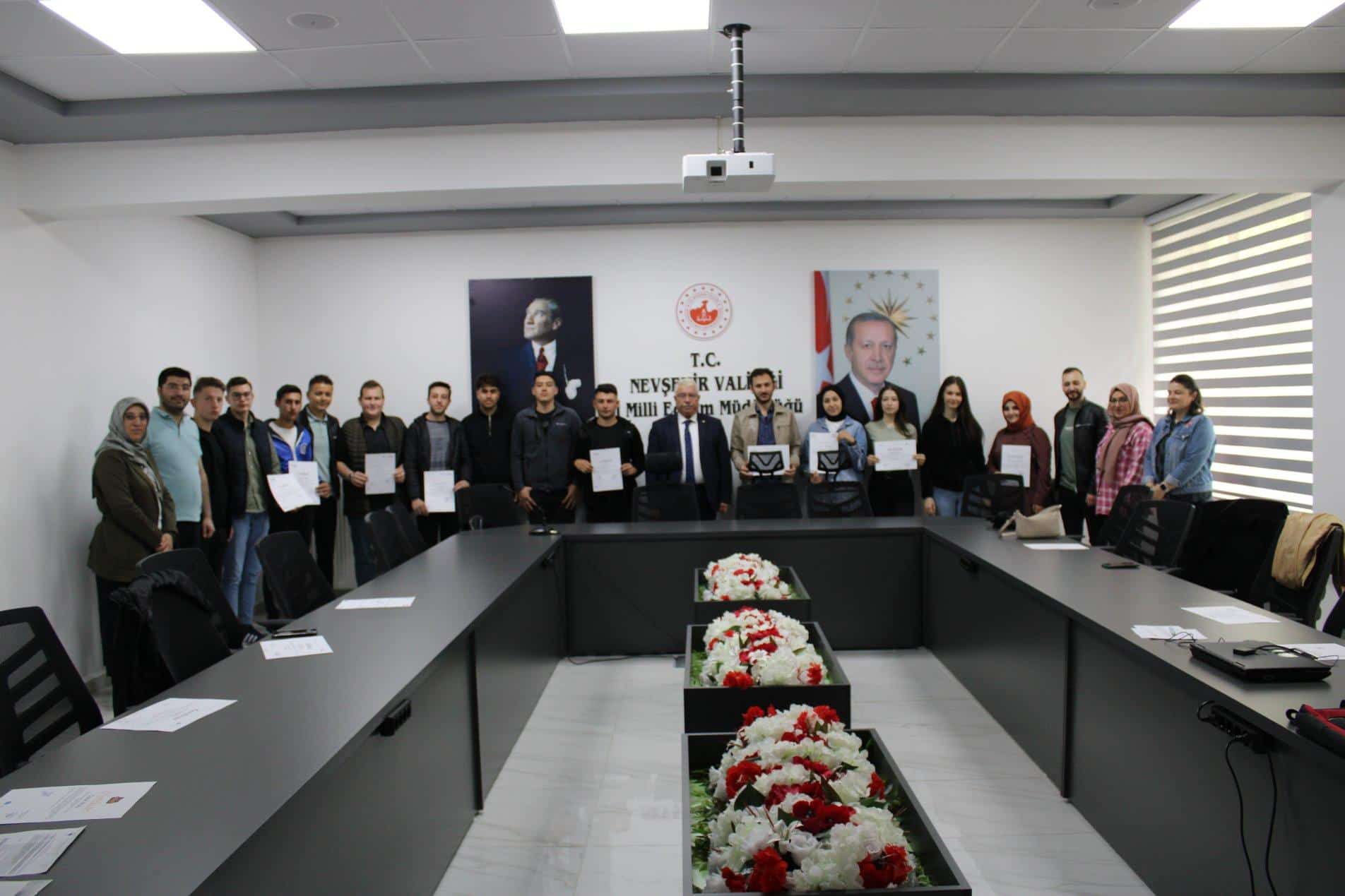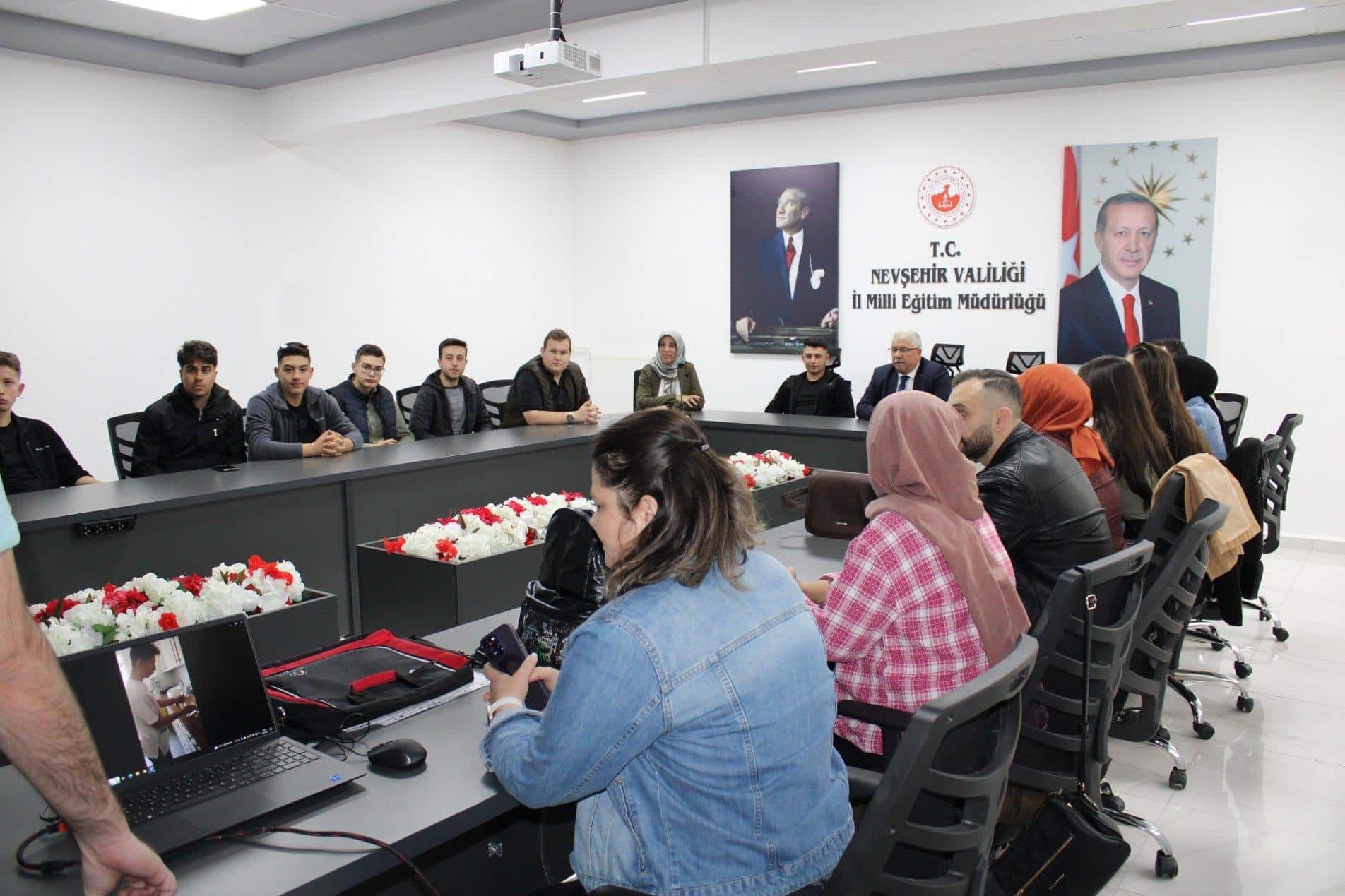 İl Milli Eğitim Müdürlüğü tarafından yürütülen “Erasmus+ Okul Eğitimi ve Mesleki Eğitim Akreditasyonu Projesi” kapsamında Avusturya’nın Viyana şehri ve Kuzey Makedonya Cumhuriyeti’nin Manastır şehrinde eğitimlere katılan ve staj yapan öğrenciler yurtdışı dönüşü İl Milli Eğitim Müdürü Yusuf YAZICI’nın katıldığı deneyim paylaşım toplasında bir araya geldiler. Mesleki eğitim akreditasyonu projesi kapsamında Viyana’da işbaşı gözlem faaliyetine katılan meslek liselerinde görev yapan 4 öğretmen ve kısa dönem öğrenci faaliyeti kapsamında 1 refakatçi öğretmen ve 12 öğrenciden oluşan 17 kişilik öğretmen ve öğrenci grubu ve aynı dönemde Kuzey Makedonya Cumhuriyetinde okul eğitimi faaliyeti kapsamında bulunan 1 refakatçi öğretmen ve 7 öğrenci yurda dönüş sonrası deneyimlerini paylaşmak üzere İl Milli Eğitim Müdürü Yusuf YAZICI ile buluştu. Mesleki eğitim akreditasyonu kapsamında kısa dönem öğrenme hareketliliği faaliyetinde bulunan öğrenciler izlenim ve deneyimlerini anlattılar.