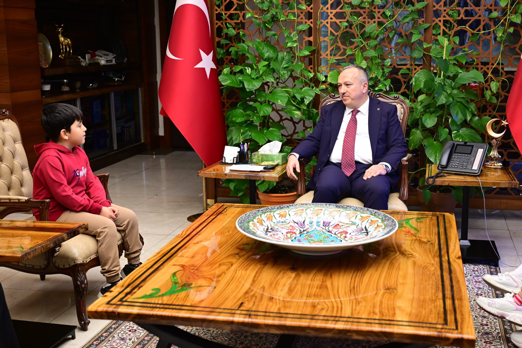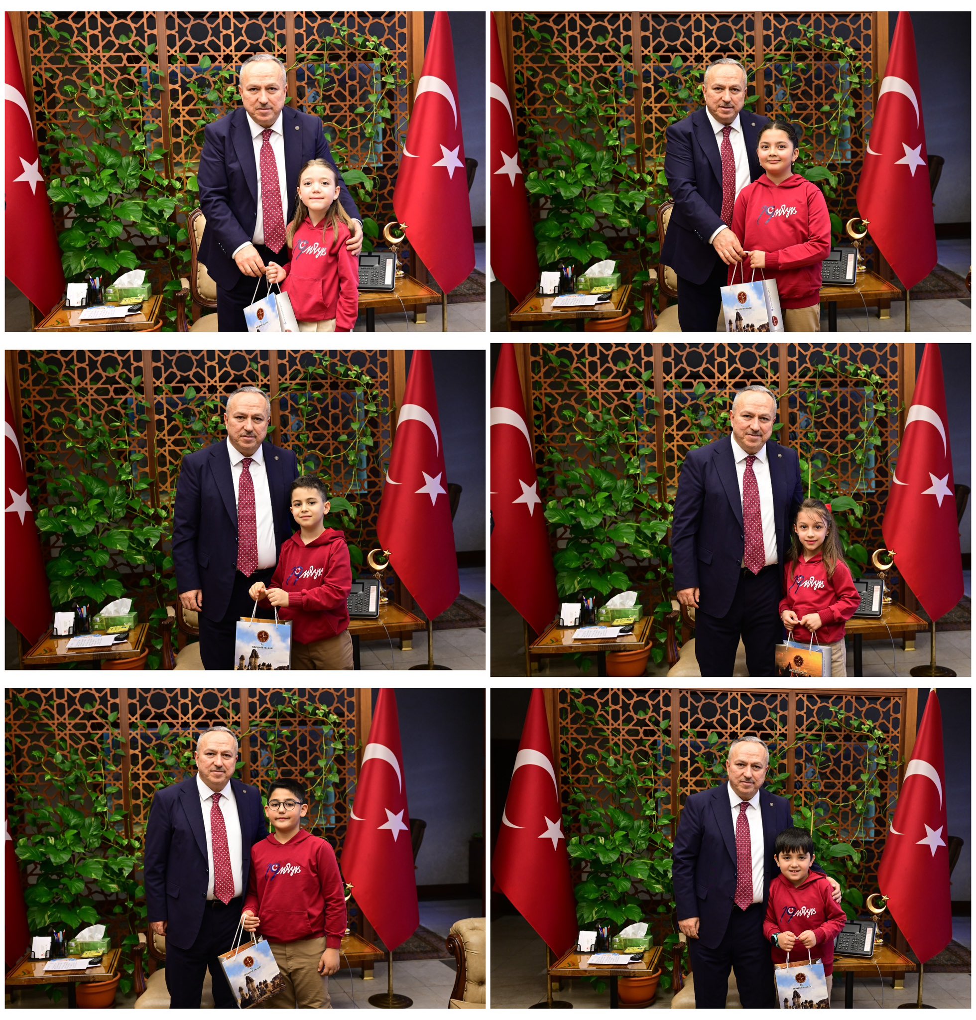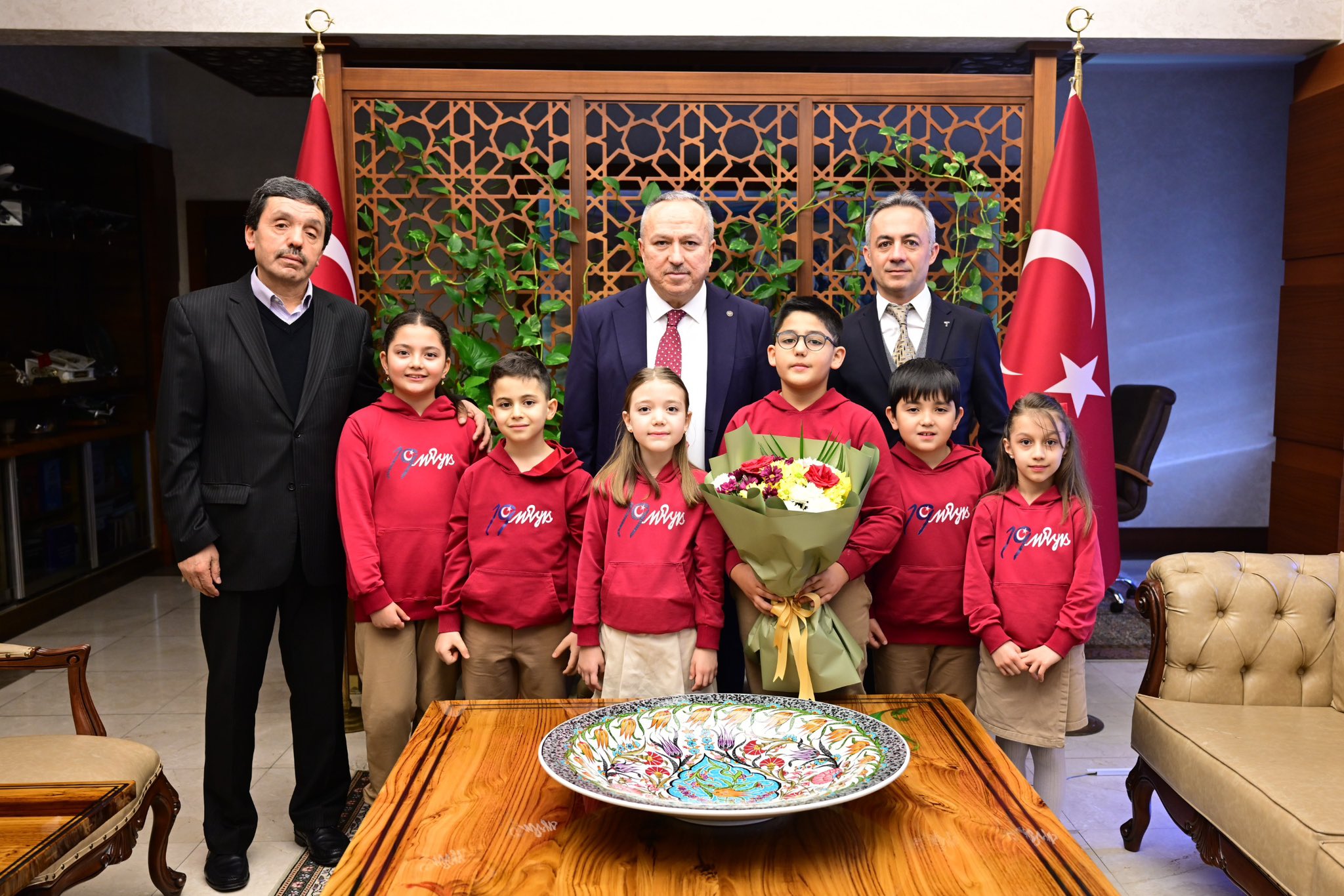 Nevşehir Valisi Ali Fidan, İl Millî Eğitim Müdürü Yusuf Yazıcı ile birlikte 19 Mayıs İlkokulu öğretmen ve öğrencilerini makamında kabul etti.