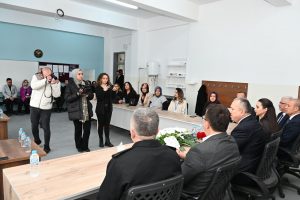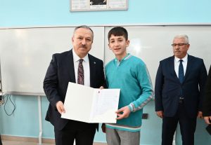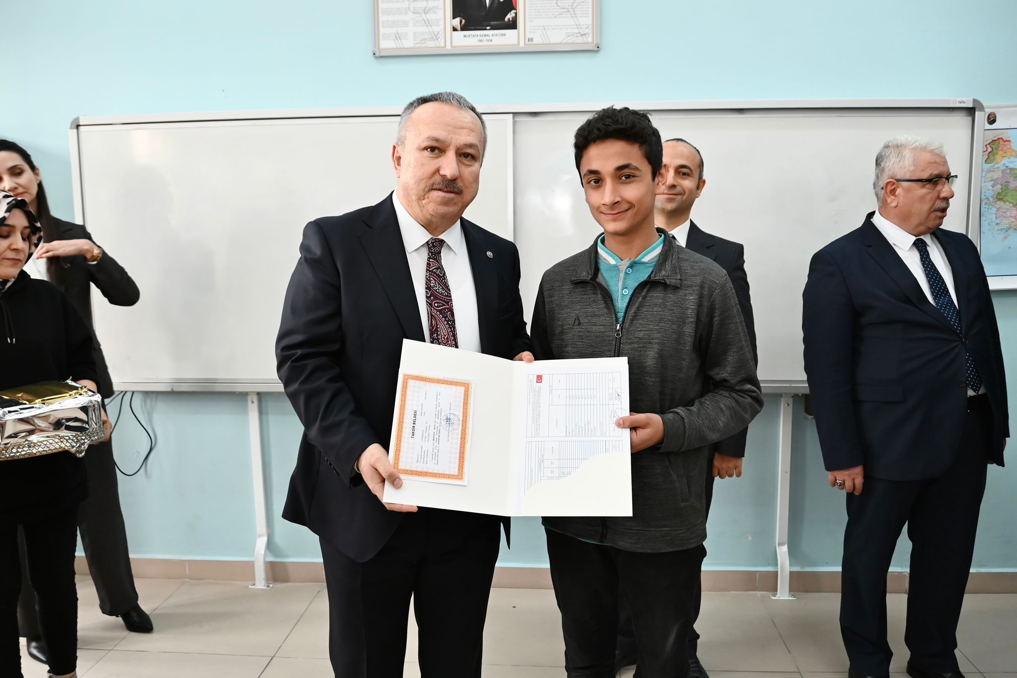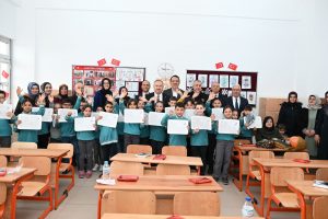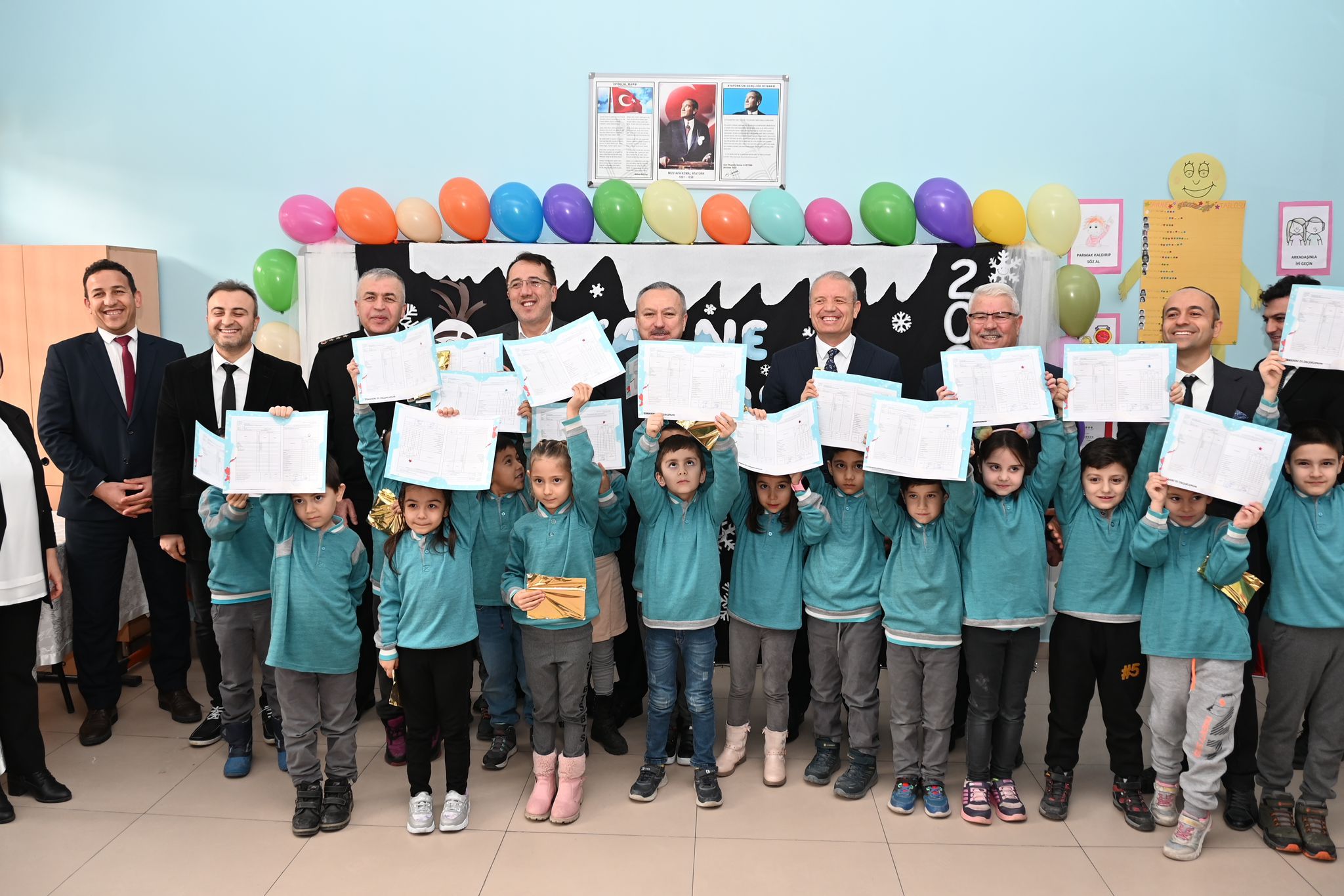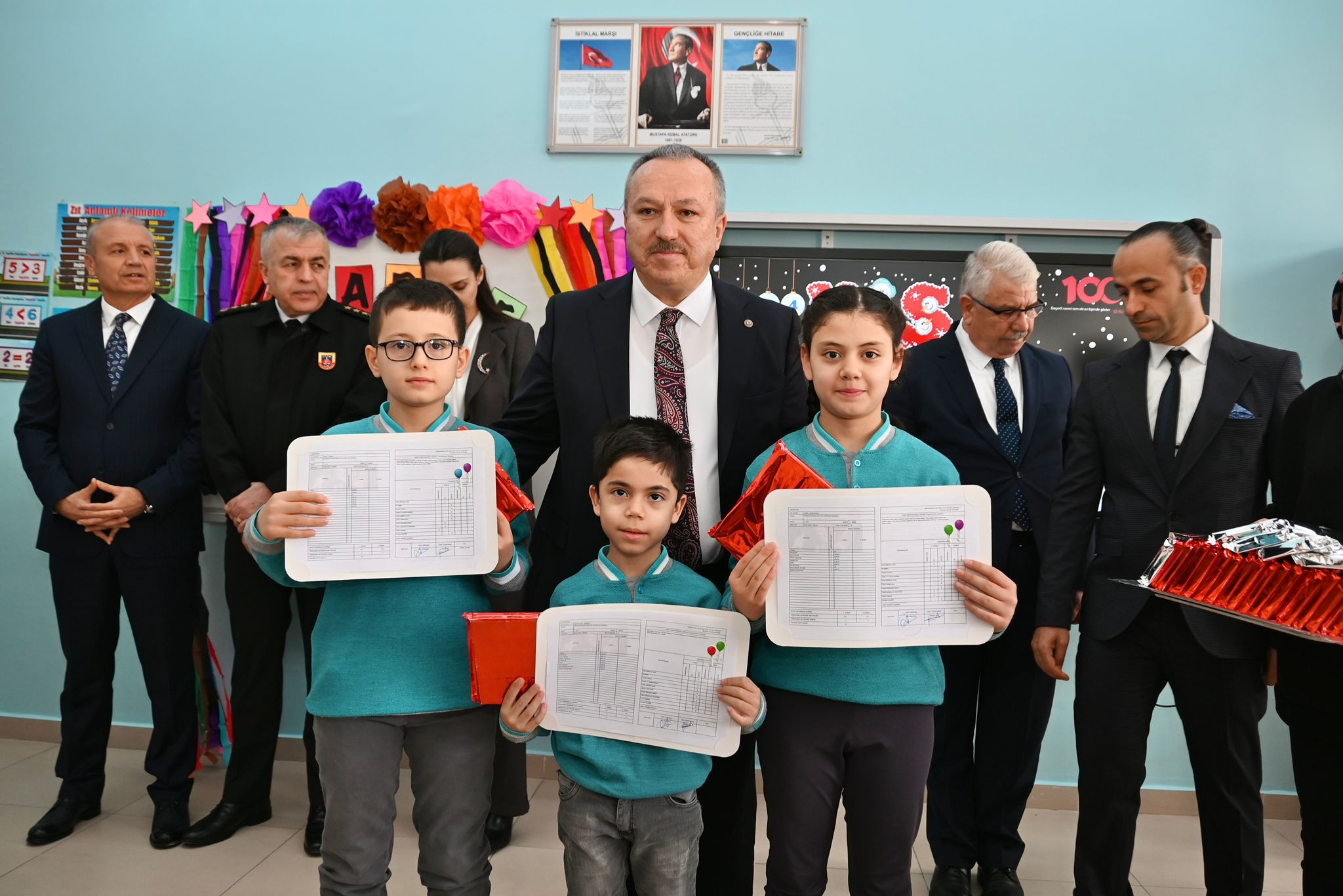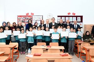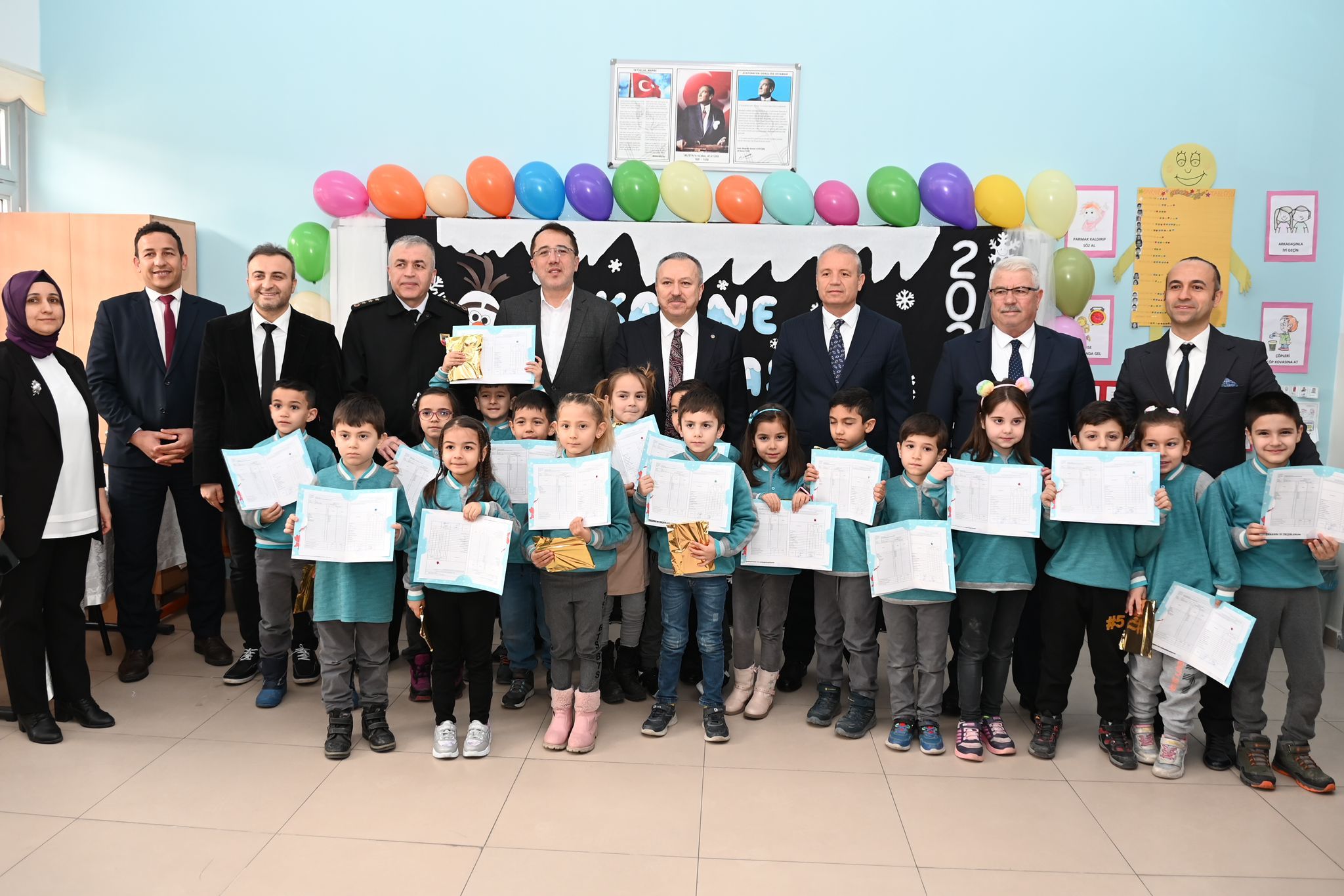 Vali Fidan, öğrencilerin karnelerini ve hediyelerini dağıtarak, günün anısına hatıra fotoğrafı çektirdi.