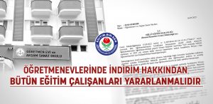 Açıklamada; “Eğitim-Bir-Sen olarak, Millî Eğitim Bakanlığı’na başvurarak, bütün eğitim çalışanlarına, öğretmenevlerinde sunulan konaklama hizmetlerinde yüzde 50 oranında indirim yapılmasını ve mevcut kapasitenin öncelikle konaklama ihtiyacı olan eğitim çalışanları için kullandırılmasını talep ettik.