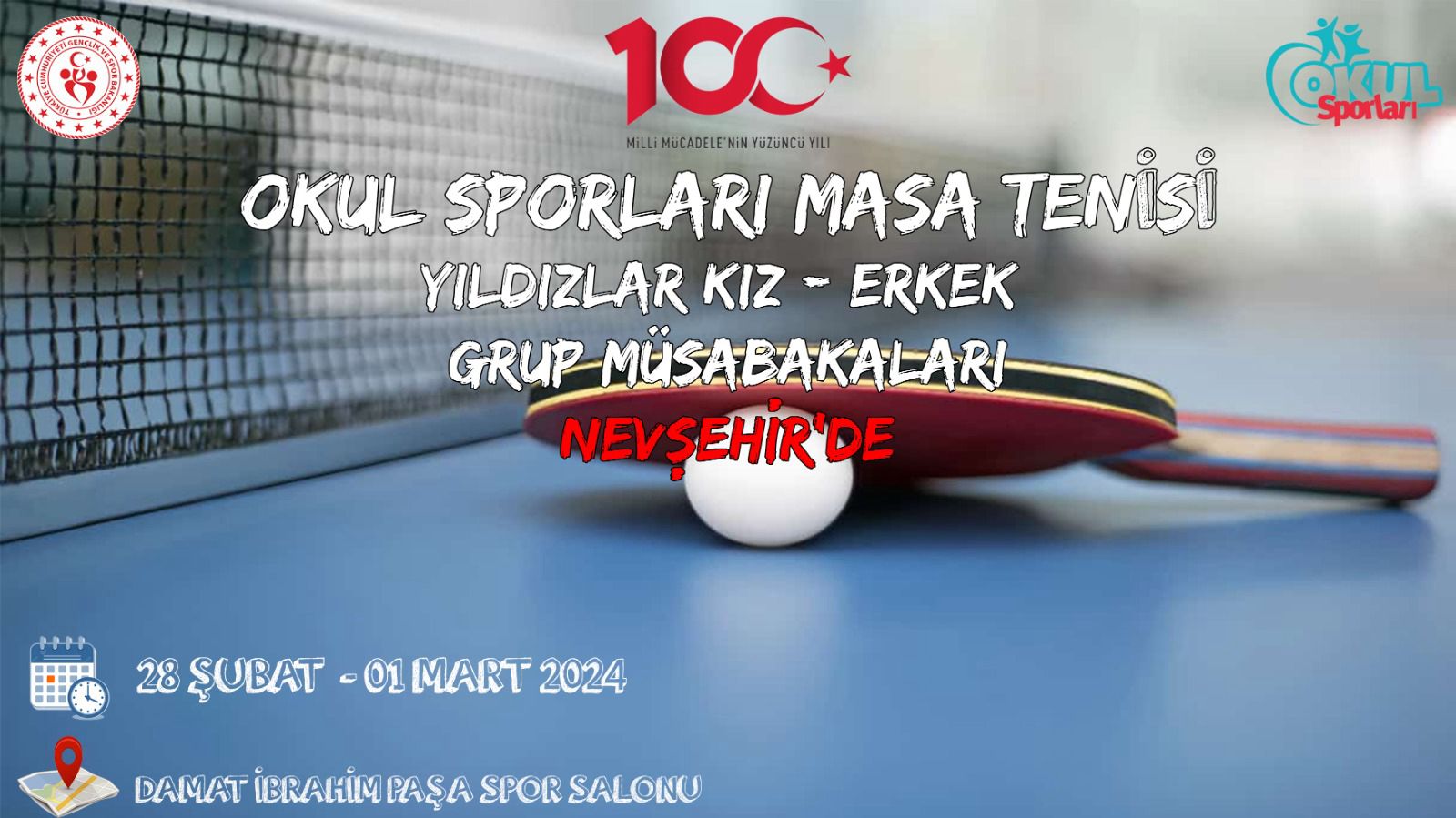 2023-2024 Yılı Okul Sporları Masa Tenisi Yıldızlar Kız – Erkek Grup Müsabakaları 28 Şubat – 01 Mart 2024 tarihleri arasında ilimiz ev sahipliğinde Damat İbrahim Paşa Spor Salonunda düzenlenecek.