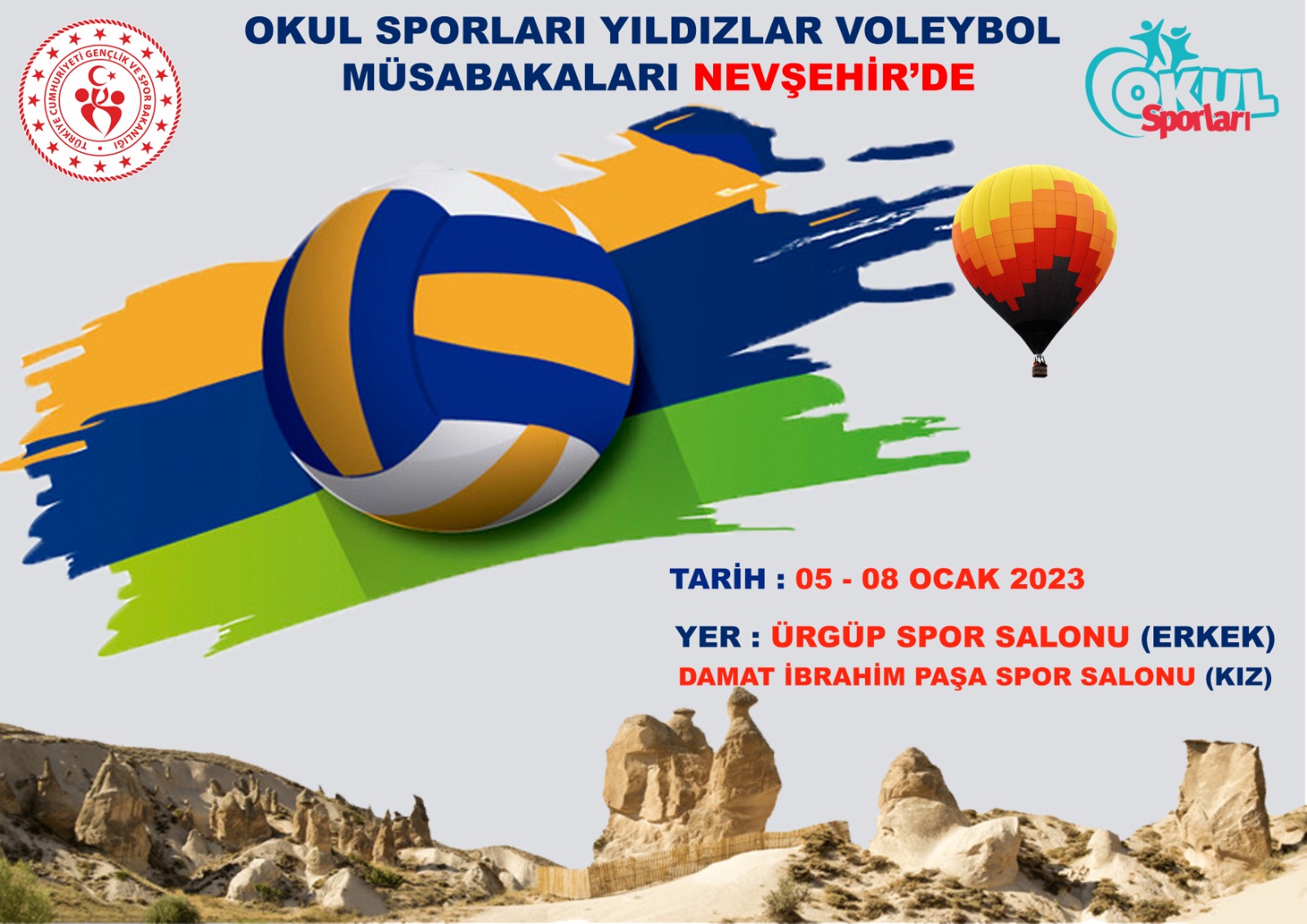 2022-2023 Yılı Okul Sporları Voleybol Yıldızlar Kız- Erkek Grup Müsabakaları 5 – 8 Ocak 2023 tarihleri arasında Nevşehir Spor İl Müdürlüğü ev sahipliğinde yapılacak.