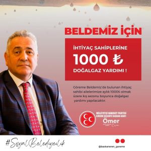 Ortaya koyduğu vizyon çalışmalarla taraflı tarafsız Göreme halkından büyük destek gören Başkan Ömer Eren yaptığı açıklamada “Göreme Beledemizde bulunan ihtiyaç sahibi ailelerimize aylık 1000 tl olmak üzere kış sezonu boyunca doğalgaz yardımı yapacağız” dedi.