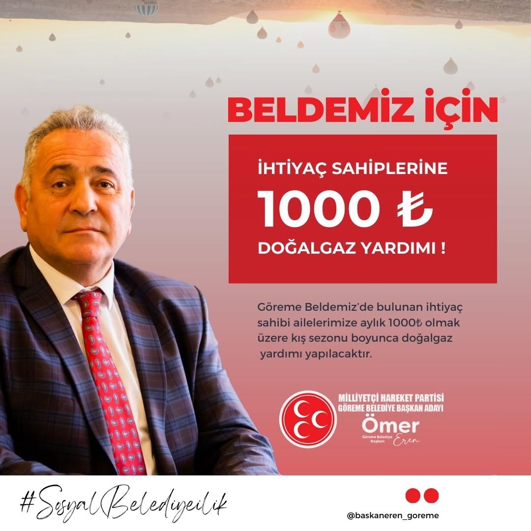Göreme Belediye Başkanı ve Başkan Adayı Ömer Eren, ihtiyaç sahibi haneler için aylık 1000 tl doğalgaz yardımı yapacaklarını söyledi. Göreme Kasaba’sına kazandırdığı projelerle beldeye İlkleri yaşatan Belediye Başkanı Ömer Eren, seçim çalışmalarını aralıksız sürdürüyor.