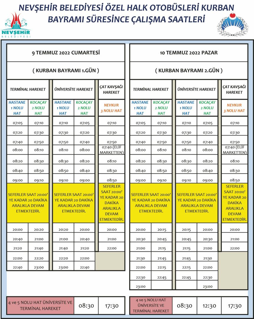 Konuyla ilgili olarak Nevşehir Belediyesi Zabıta Müdürlüğü’nden yapılan açıklamada, 9 Temmuz Cumartesi günü başlayacak ve 12 Temmuz Salı günü sona erecek olan Kurban Bayramı süresince özel halk otobüslerini kullanacak olan vatandaşların mağduriyet yaşamaması için sefer saatlerinde düzenlemeye gidildiği belirtildi.