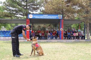 Burada özel eğitimli köpeklerin bomba arama, itaat, yanıcı madde bulma, engel parkurundan geçiş gibi çeşitli gösterilerini büyük bir ilgiyle izleyen öğrenciler gösterinin ardından köpeklerle yakından ilgilendi.