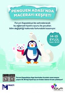 Gelişim Ankara Çocuk Tiyatrosu oyuncuları ile iklim krizine farkındalık sağlayan “Penguenler Adası” çocuk oyunu 14-15 Eylül 2024 tarihlerinde saat 16.00’da, Forum Kapadokya etkinlik alanında olacak. Penguen Adası’nın çevre kirliliğinden dolayı yaşadığı olumsuzlukları ve adayı kurtarmak için maceraya atılan penguen Sam ve arkadaşı kutup ayısı Kevin’in maceralarını kaçırmayın!