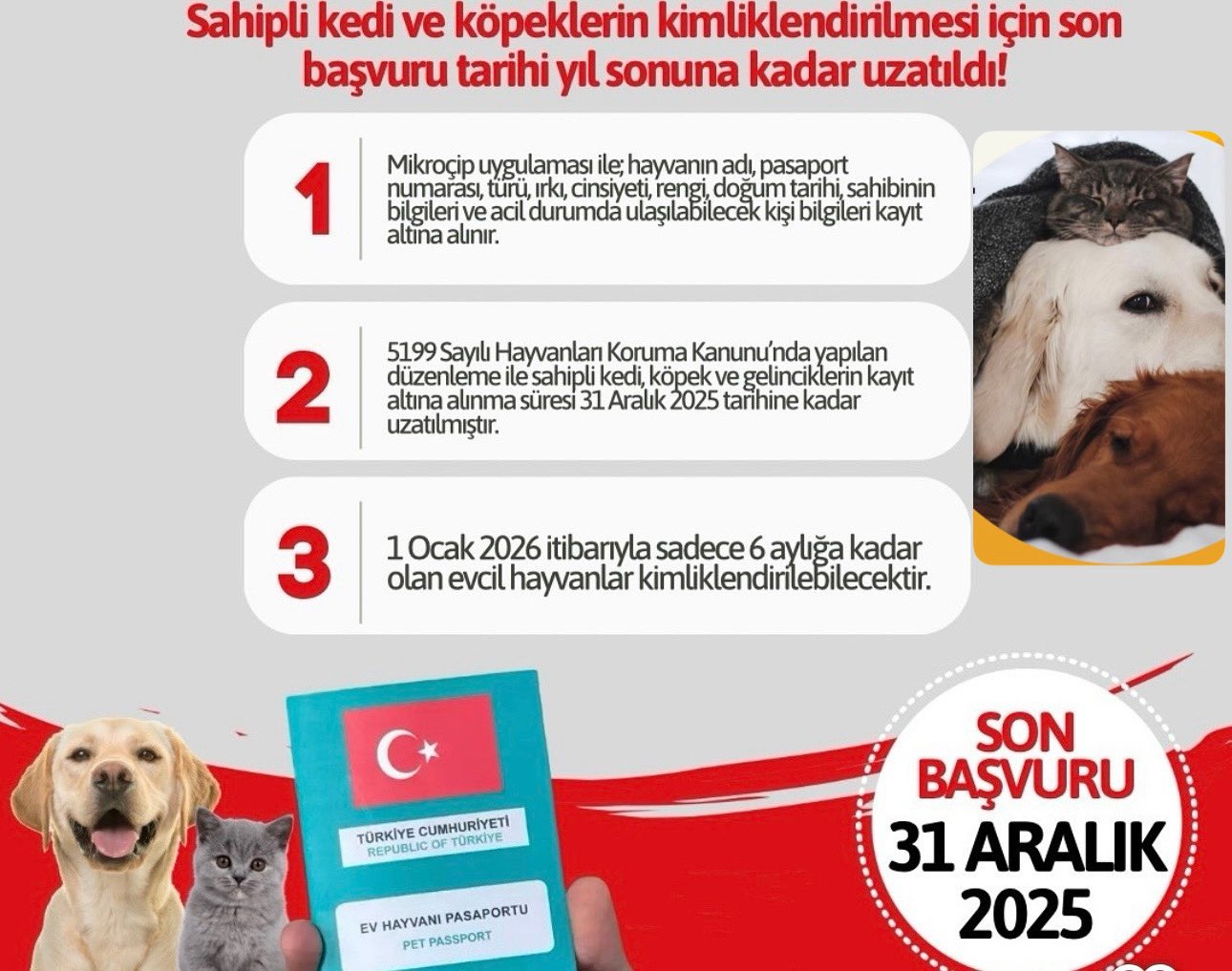 Nevşehir İl Tarım ve Orman Müdürlüğü, 5199 sayılı Hayvanları Koruma Kanunu kapsamında kedi ve köpek sahiplerine önemli bir hatırlatmada bulundu. Yapılan düzenleme gereği, her yaştaki kedi ve köpeklerin PETVET sistemine kayıt işlemleri için son başvuru tarihinin 31 Aralık 2025 olduğu belirtildi.