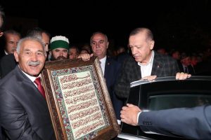 15 Ağustos Cumartesi günü Cumhurbaşkanı Recep Tayyip ERDOĞAN’ ın teşrifleriyle gerçekleşen Hacıbektaş-ı Veli anma programına katılan Nevşehir Esnaf ve Sanatkarlar Odaları Birliği Başkanı Mehmet PINARBAŞI düzenlenen program sonrası Cumhurbaşkanı ERDOĞAN’ a Avanoslu ev hanımlarının işlediği çini Ayetel Kürsi Tablosu takdim etti.