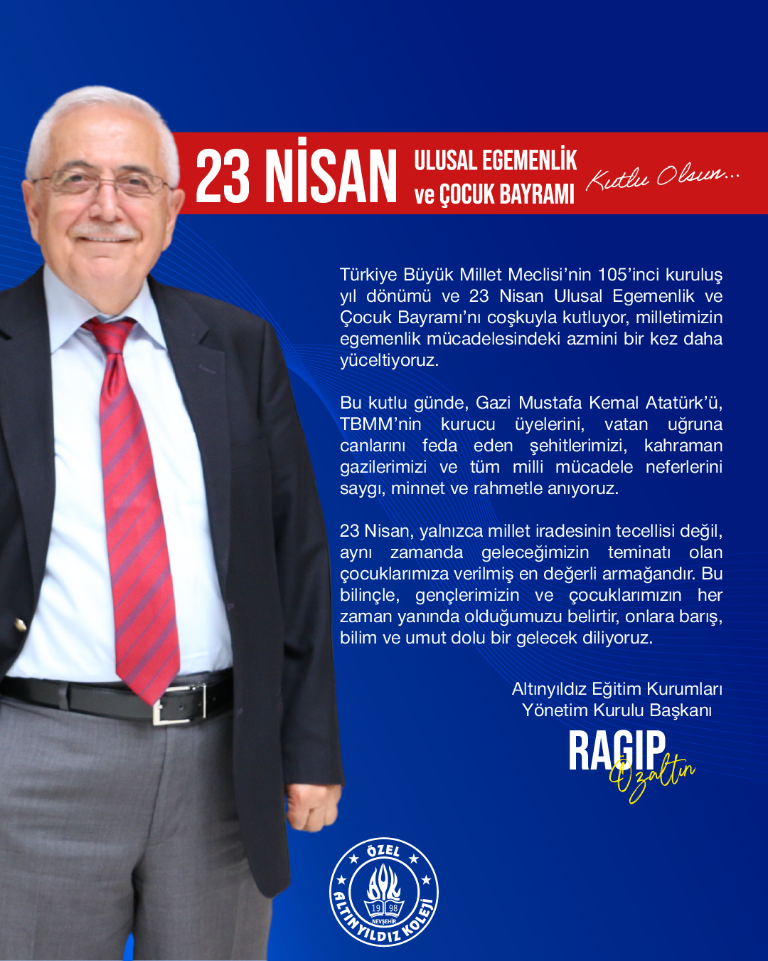 Altınyıldız Eğitim Kurumları Yönetim Kurulu Başkanı Ragıp Özaltın açıklama yaparak 23 Nisan Ulusal Egemenlik ve Çocuk Bayramını kutladı.
