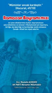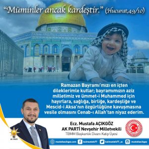 Ramazan Bayramı, yeni sevinçlerimizin müjdesi olacak inşallah. “Şüphesiz zorlukla beraber bir kolaylık vardır. Gerçekten, zorlukla beraber bir kolaylık vardır.” (İnşirâh, 94/5-6), ilahi müjdesi; ülkemiz, Müslüman kardeşlerimiz ve tüm insanlık için en kısa sürede tecelli etsin inşAllah. Dünyada zulümlerin ve zalimlerin son bulduğu; vatanımızda, yakın coğrafyamızda, ilk kıblemiz Mescid-i Aksa’da, Kudüs’te, mahzun coğrafyalarda, Türk-İslam âleminde ve tüm dünyada sağlık, birlik, beraberlik, huzur, barış, güven ve istikrar ortamının hâkim olduğu, dargınların barıştığı, hoşgörülü nice bayramlara ulaşmayı Yüce Mevla’dan niyaz ederim.