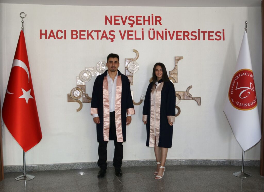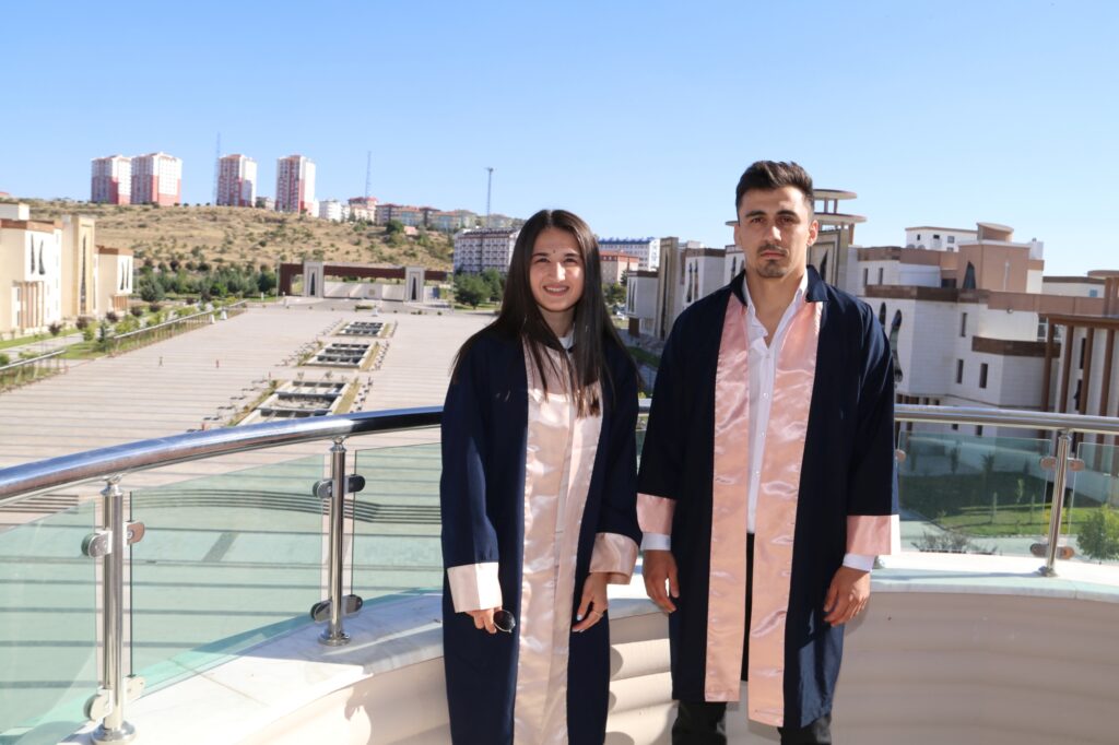 Eğitim Fakültesi İlköğretim Matematik Öğretmenliği Bölümü öğrencisi Kevser Koç ile Eğitim Fakültesi Beden Eğitimi ve Spor Bölümü öğrencisi Emre Topal, üniversitede geçirdikleri güzel günlerini yâd ederek mezun olmanın heyecanını ve sevincini buruk da olsa yaşamak için kampüsün farklı noktalarında mezuniyet hatırası olarak fotoğraf çekindiler.