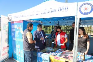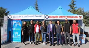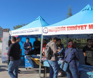 Nevşehir Emniyet Müdürlüğü’ne bağlı Asayiş, Güvenlik, Narkotik ve Terörle Mücadele Şube Müdürlüğü personelinin, NEVÜ öğrencilerine çeşitli konularda bilgi verdiği ve broşür dağıttığı standı ziyaret eden Rektör Prof. Dr. Aktekin, emniyet personelinden bilgi aldı.