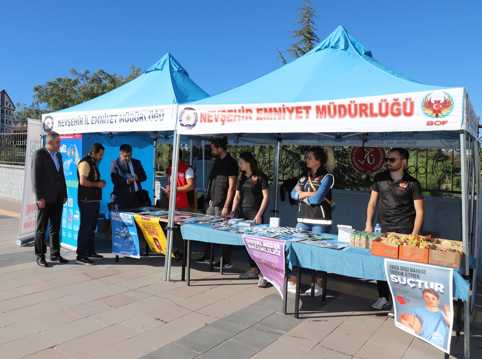 Nevşehir Emniyet Müdürlüğü’ne bağlı Asayiş, Güvenlik, Narkotik ve Terörle Mücadele Şube Müdürlüğü personeli ayrıca, öğrencilerin herhangi bir sorun ve talepleri olması halinde emniyet birimlerinin her zaman yanlarında olduklarını belirterek, kendilerine not defteri, kalem, anahtarlık, kek ve meyve suyu ikramında bulunarak, bilgilendirme ve önleme faaliyetlerine yönelik hazırlanan ‘El Ele Güvenli Geleceğe’ konulu uyarıcı broşürler dağıttı.