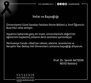 Rektör Aktekin mesajında “Üniversitemiz Güzel Sanatlar Fakültesi Resim Bölümü 4. sınıf öğrencisi Buse Kilci vefat etmiştir. Hayatının baharında genç bir insanı, üniversitemizin değerli bir öğrencisini kaybetmiş olmanın derin üzüntüsü içerisindeyiz.