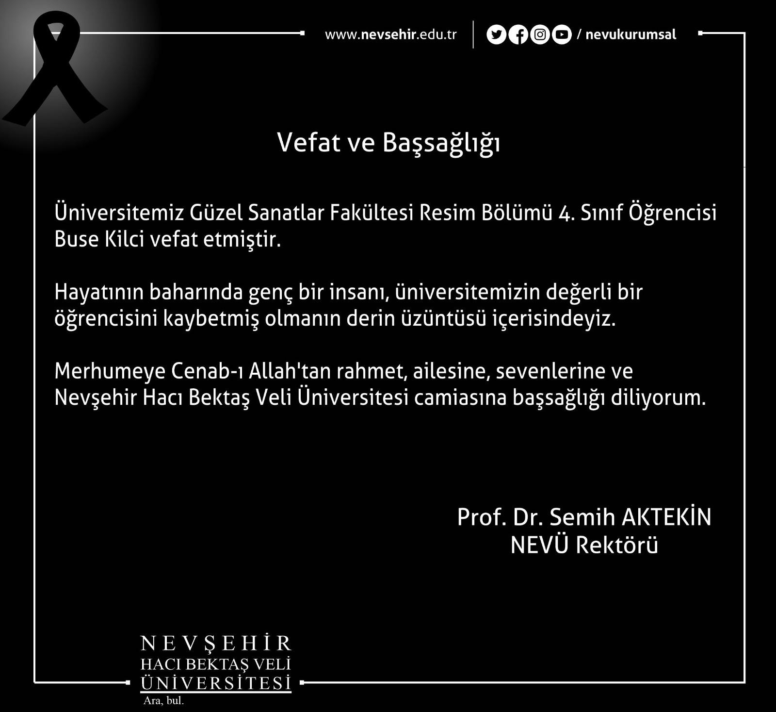 Nevşehir Hacı Bektaş Veli Üniversitesi (NEVÜ) Rektörü Prof. Dr. Semih Aktekin, vefat eden NEVÜ öğrencisi Buse Kilci için taziye mesajı yayınladı.