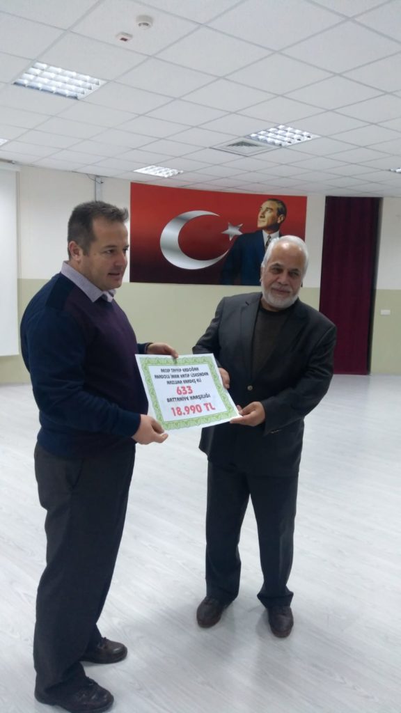 Toplanan yardım Türkiye sınırında bulunan ve İdlip’ten gelen mültecilerin oluşturduğu kamplara sevk edilmesi için Nevşehir İHH Başkanı Baki Öncel’e Okul Müdürü Veli Sağır tarafından makbuz karşılığı teslim edildi.