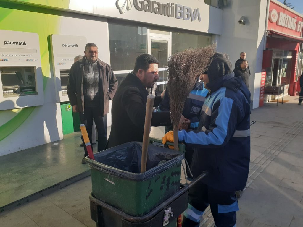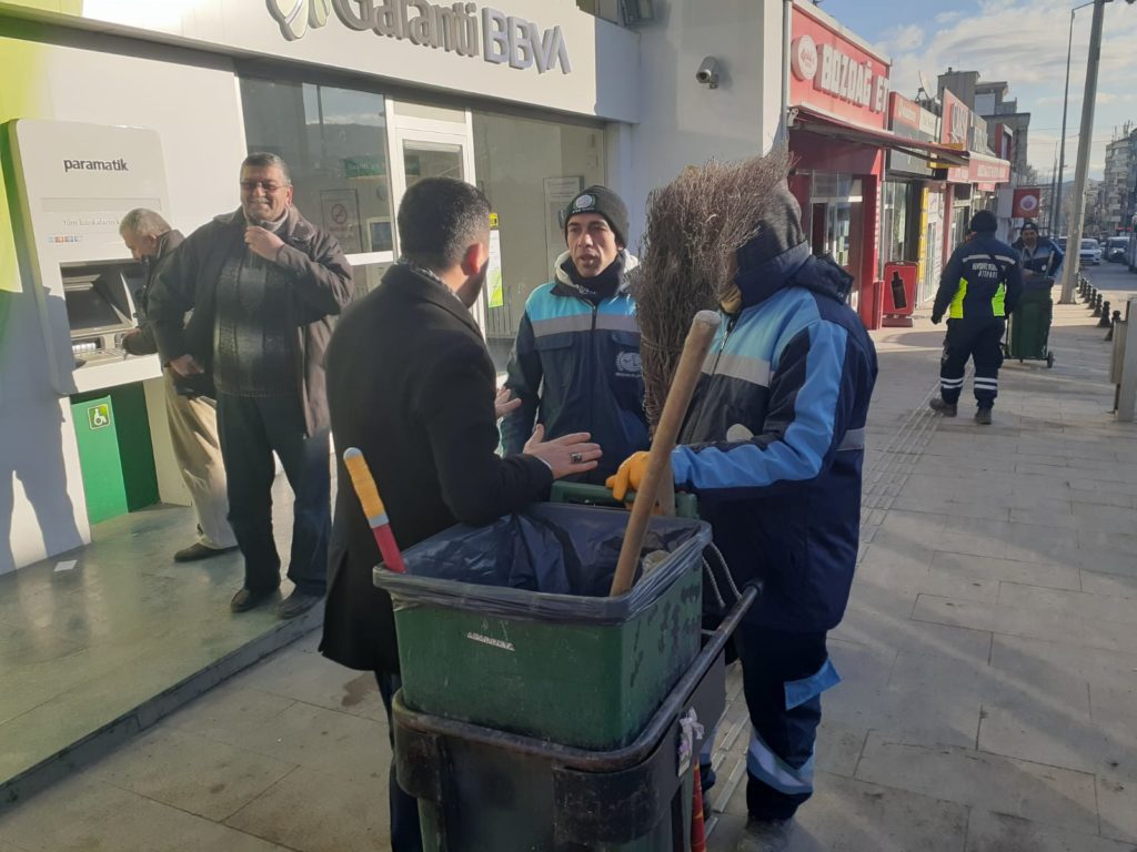 Sahada çalışan belediye ekiplerini de yaya olarak ziyaret eden Arı, belediye personellerine işlerinde kolaylıklar diledi.