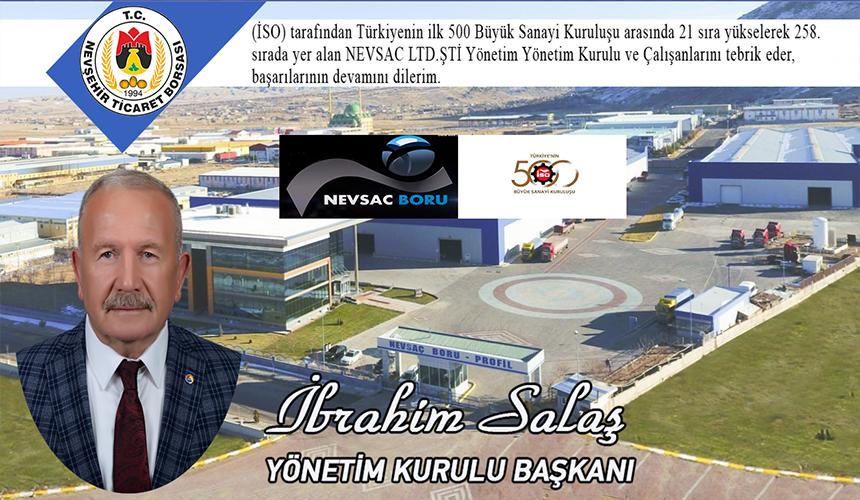 Nevşehir Ticaret Borsası Yönetim Kurulu Başkanı İbrahim Salaş; “Nevşehir OSB’de sanayi boruları ve profil üretimi ile Ülkemizde Demir-Çelik sektörünün önde gelen firmalarından birisi olmayı başaran “NEVSAC METAL” firmamız bu defa Türkiye’nin ilk 500 büyük sanayi kuruluşu 2022 yılı sıralamasında 258. sırada yer aldı… Nevşehir’e büyük gurur yaşatan “NEVSAC METAL” yöneticilerini ve çalışanlarını tebrik eder, başarılarının devamını dilerim” dedi.