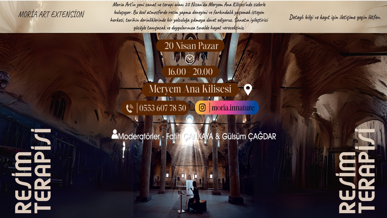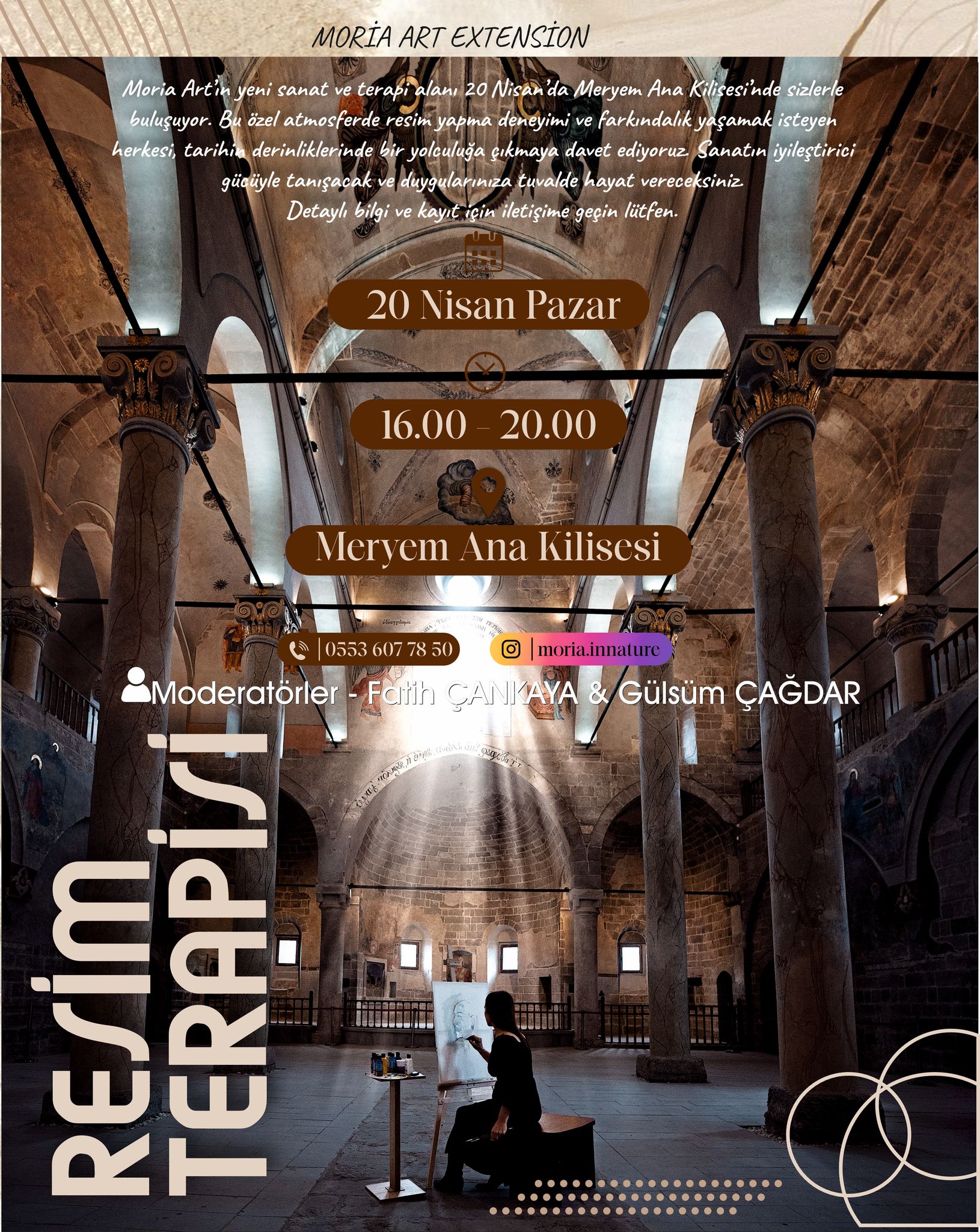Mini bir klasik müzik konseriyle başlayacak olan Resim Terapisi özel bir etkinlik olarak hafızalarımızda yer alacak. Resim sanatçıları Fatih Çankaya ve Gülsüm Çağdar’ın organize edeceği programda Moria Art’ın yeni sanat ve terapi alanı 20 Nisan’da Meryem Ana Kilisesi’nde sanatseverlerle buluşacak.