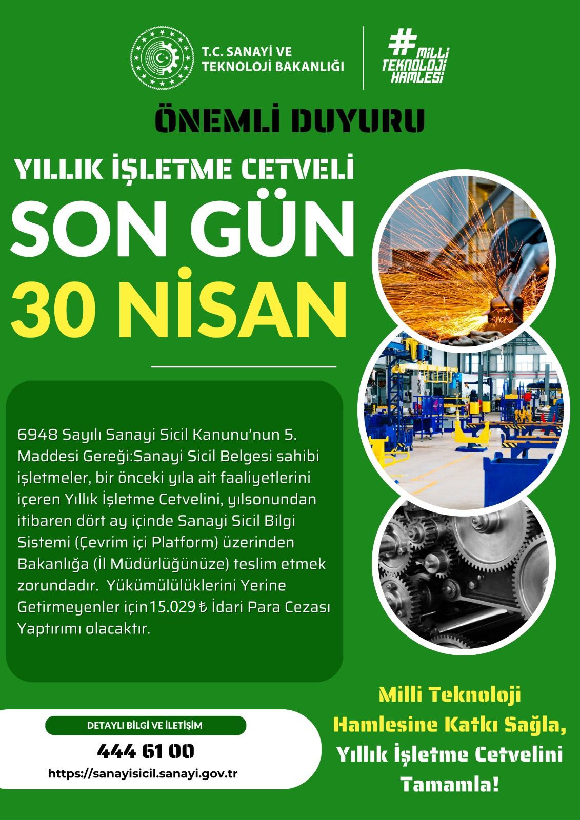 Bu kapsamda, sanayi siciline kayıtlı işletmelerin 2025 yılına ait Yıllık İşletme Cetvellerini, Sanayi ve Teknoloji Bakanlığı tarafından yayımlanan SGM 2014/11 No’lu Tebliğ doğrultusunda e-Devlet Kapısı veya Sanayi Sicil Bilgi Sistemi (sanayisicil.sanayi.gov.tr) üzerinden elektronik ortamda vermeleri gerektiği ifade edildi.