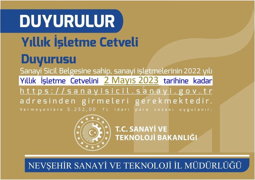 Yıllık İşletme Cetveli bilgilerini 30 Nisan 2023’e kadar (Söz konusu tarihin bu yıl resmi tatile denk gelmesi nedeniyle 2 Mayıs 2023 tarihi sonuna kadar) internet ortamında süresi içinde giriş yapmayan işletmelere 6948 sayılı Sanayi Sicili Kanunu’nun 9.Maddesi gereğince 5.252,00 (beşbinikiyüzelliiki) TL idari para cezası uygulanacak.