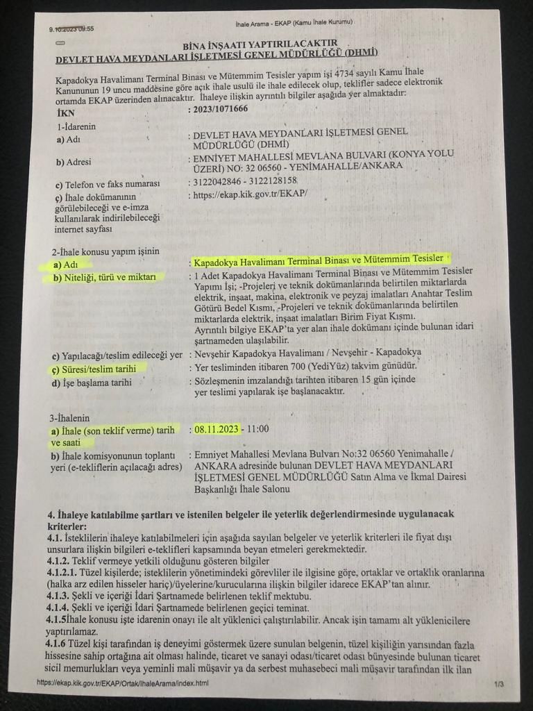 Ak Parti Nevşehir İl Başkanlığından konuya dair yapılan açıklamada “Kapadokya Havalimanı terminal binası ve mütemmim tesisler 08.11.2023 tarihinde yapım ihalesine çıkıyor.