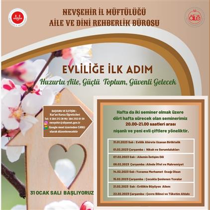 Nevşehir İl Müftülüğü Aile ve Dini Rehberlik Bürosu tarafından düzenlenecek seminerler Google Meet üzerinden yapılacak olup 4 hafta sürecek.